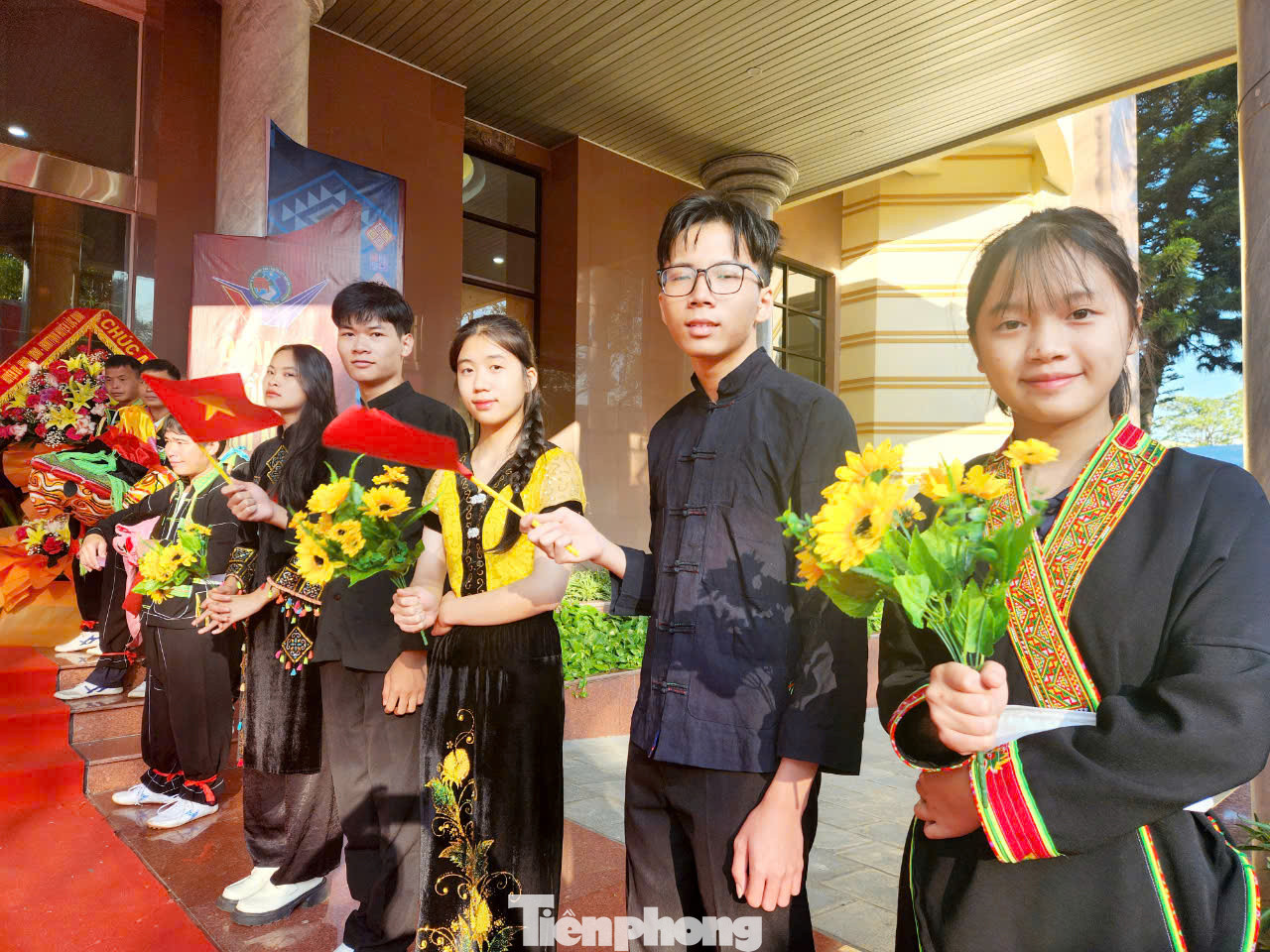 Thầy cô giáo và các em thiếu niên, nhi đồng phấn khởi với sắc phục dân tộc mình. (ảnh: Duy Chiến)