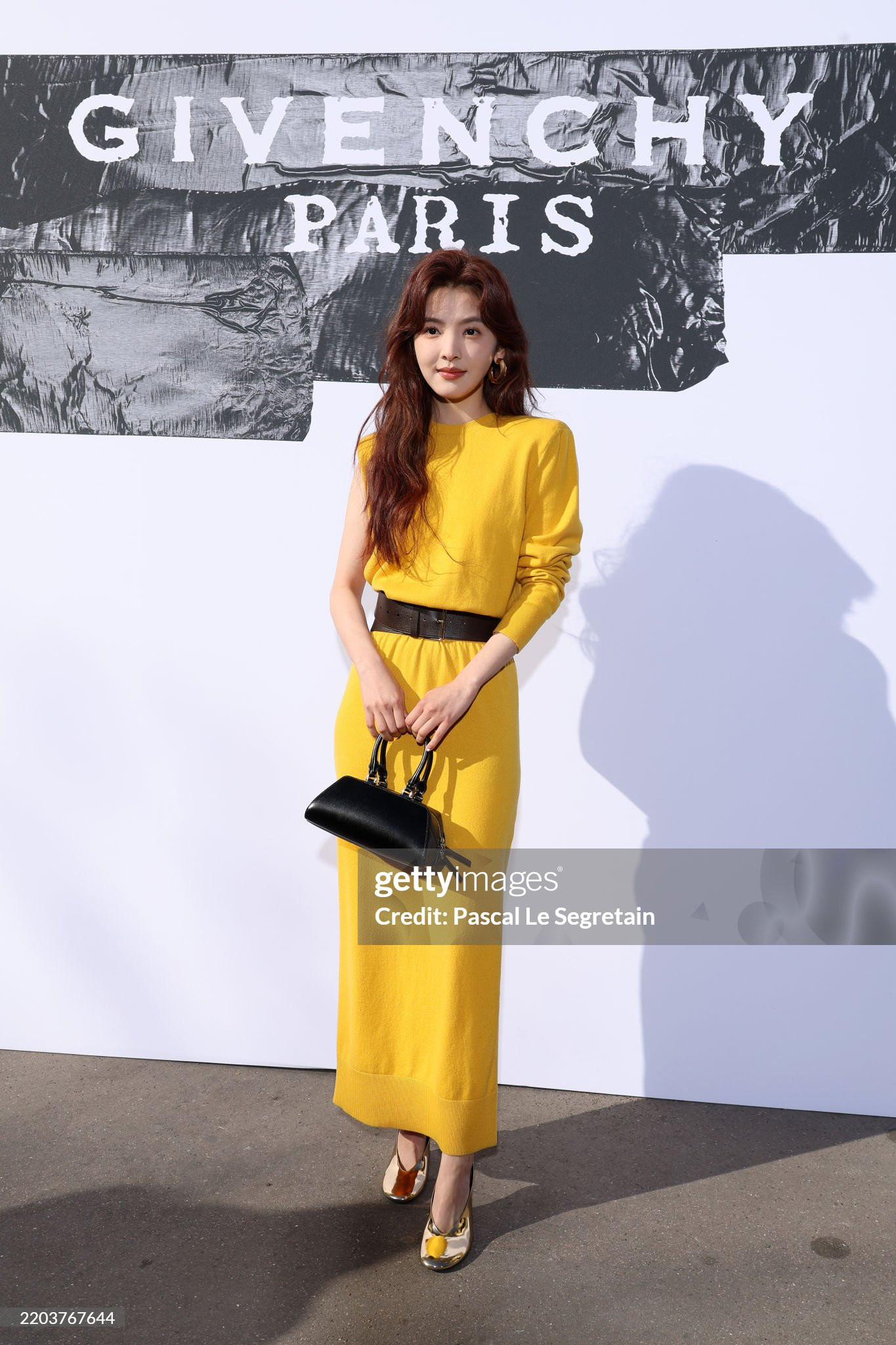 Chương Nhược Nam có bản phối nổi bật tại buổi trình diễn BST Thu Đông 2025 của thương hiệu Givenchy. Mỹ nhân Hoa ngữ mặc mẫu đầm vàng bất đối xứng, tạo điểm nhấn với thắt lưng to bản và túi xách cùng tông đen.