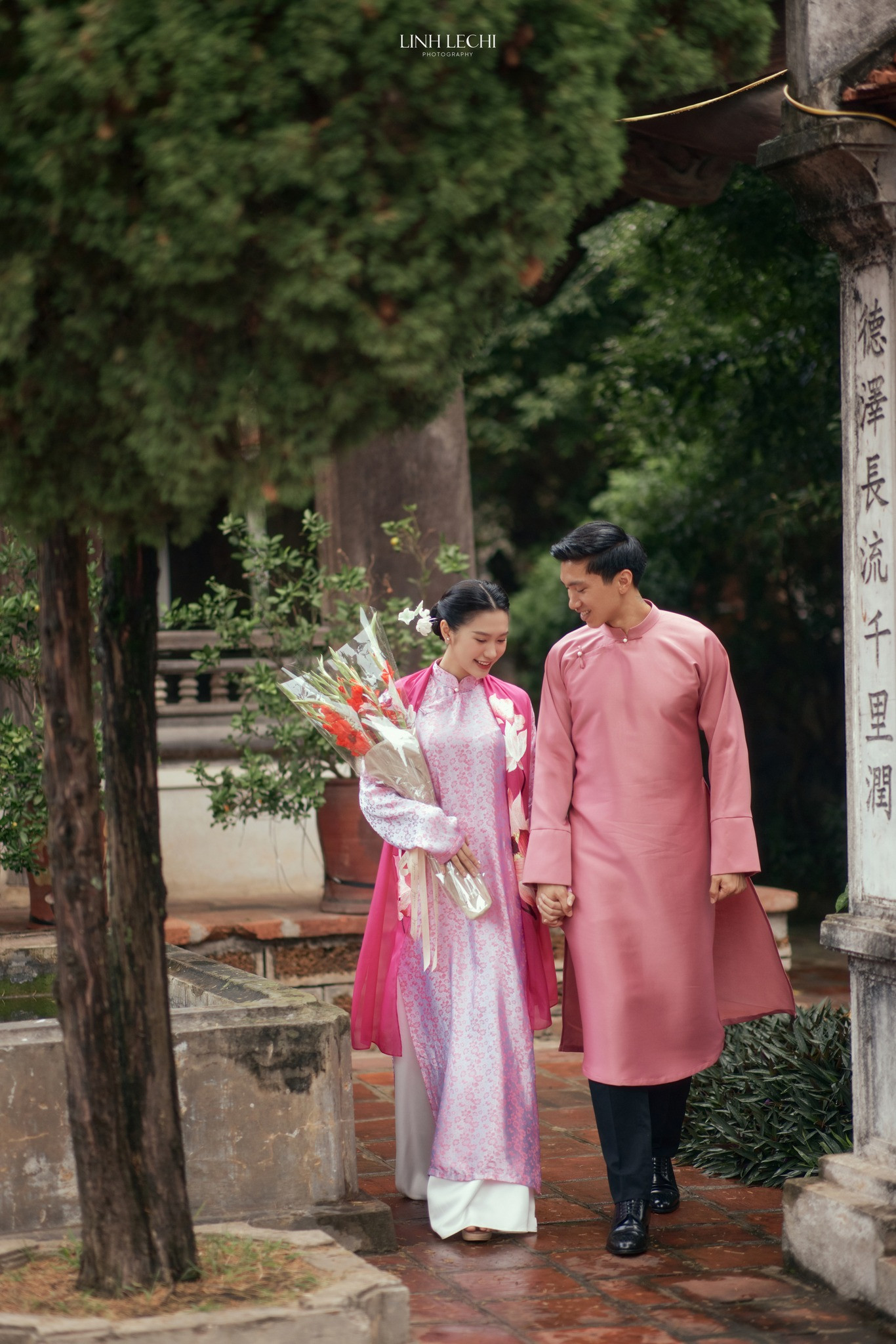 Cả hai cặp đôi đều chụp ngoại cảnh ở những nơi có bối cảnh cổ kính, rất hợp với trang phục áo dài truyền thống. Dựa vào bức ảnh mới được hé lộ, netizen đoán Quang Hải và Chu Thanh Huyền cũng chụp ở một ngôi chùa cổ kính, giống như vợ chồng Đoàn Văn Hậu.