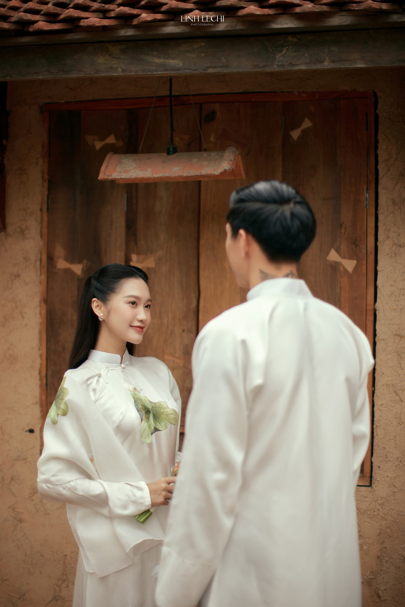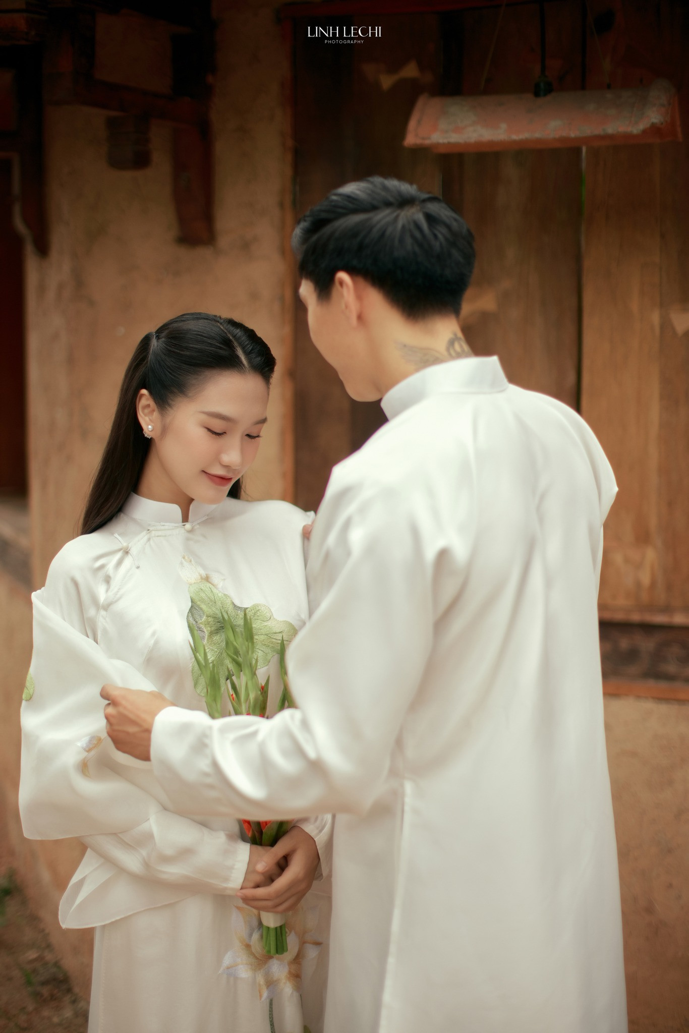 Hai vợ chồng Đoàn Văn Hậu thay đổi hai bộ áo dài có màu sắc khác nhau cho bộ ảnh cưới. Cả hai đều mang kiểu dáng suông rộng nhẹ nhàng, khoe vẻ đẹp dịu dàng cổ điển của cô dâu Doãn Hải My.