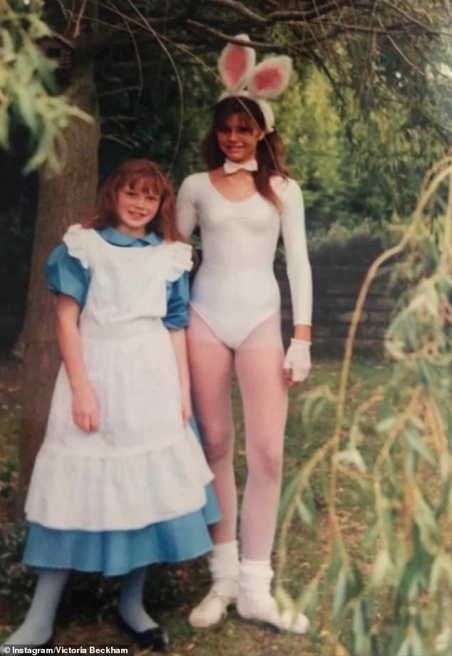 Một bức ảnh thời tuổi teen mới đây vừa được chính bà Becks chia sẻ trên mạng xã hội. Trong đó, cựu thành viên Spice Girls mặc bộ đồ leotard bó sát, đeo tai thỏ Playboy và cài nơ ở cổ, nụ cười tươi khác hẳn vẻ lạnh lùng băng giá như hiện tại. Có thể thấy, Victoria thời tuổi teen đã có vóc dáng cao gầy như "sếu vườn". Trong ảnh, cô chụp cùng em gái Louise đóng vai Alice ở xứ sở thần tiên.