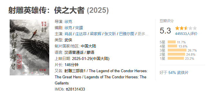 Mùa Tết ngày ở rạp Trung có 6 bộ phim gồm: Na Tra, Thám Tử Đường Phố 1900, Gấu Boonie, Phong Thần 2, Hành Động Giao Long và Anh Hùng Xạ Điêu. Tính tới ngày 9/2, doanh thu của Anh Hùng Xạ Điêu đạt khoảng 624,293 triệu NDT (hơn 2.100 tỷ đồng), thấp nhất trong 6 tựa phim, tỷ lệ doanh thu chỉ chiếm khoảng 0,6 - 0,7%.