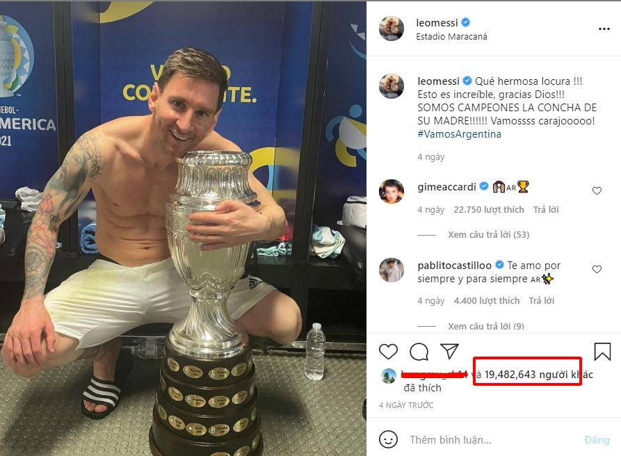 Con số 19 triệu này bỏ rất xa những ngôi sao thể thao khác. Bài đăng trên Instagram của LeBron James thương tiếc Kobe Bryant thu hút 15,5 triệu lượt thích, trong khi bài đăng trước đó của Messi về sự ra đi của huyền thoại Diego Maradona có 16,4 triệu lượt thích.