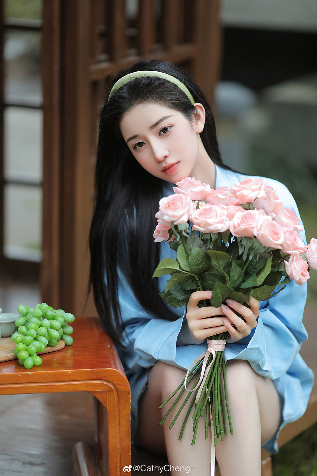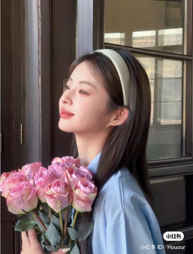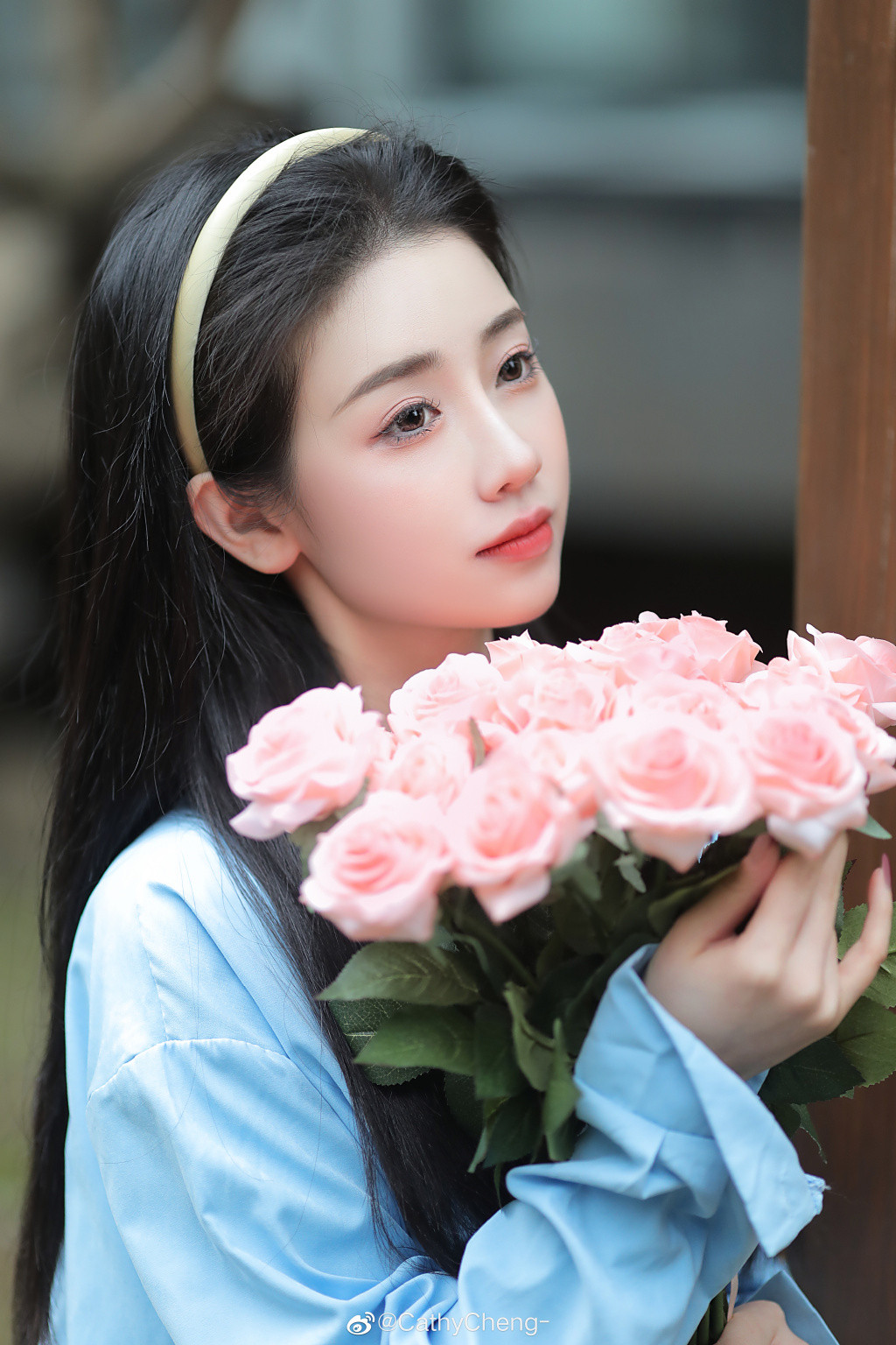 Để có được bộ ảnh "bắt trend" Lưu Diệc Phi cũng không quá phức tạp: Chỉ cần một chiếc áo sơ mi màu xanh dương, một chiếc băng đô màu lục nhạt, một bó hoa hồng và một lớp trang điểm nhẹ nhàng theo tông hồng xinh xẻo.