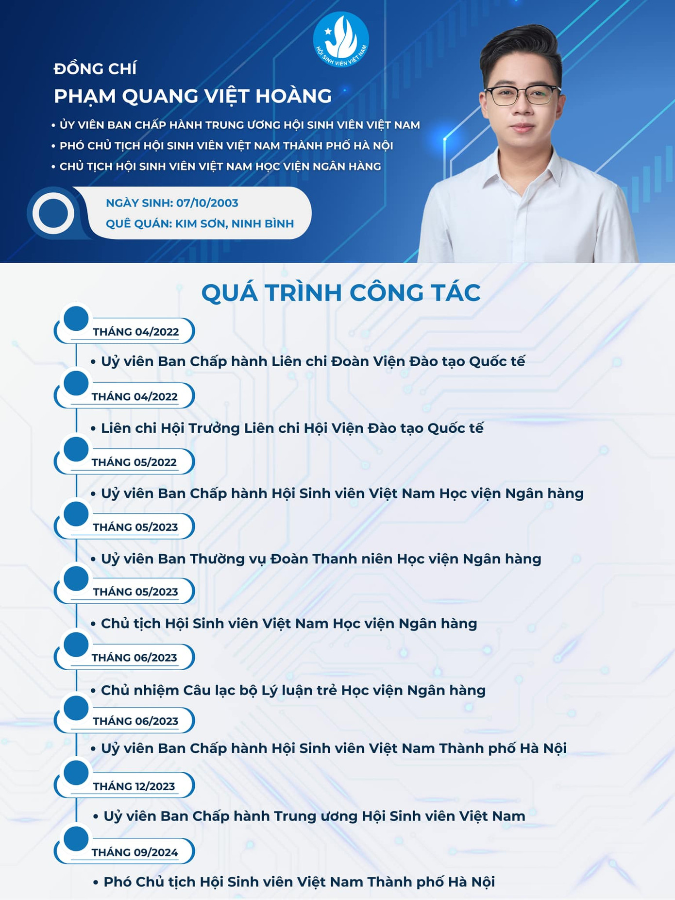 Sau quá trình hiệp thương, anh Phạm Quang Việt Hoàng - Chủ tịch Hội Sinh viên Học viện Ngân hàng, đã được tín nhiệm bầu giữ chức danh Phó Chủ tịch Hội Sinh viên TP. Hà Nội, khóa VIII, nhiệm kỳ 2023 - 2028.