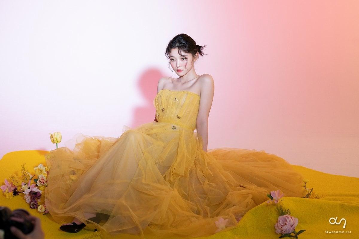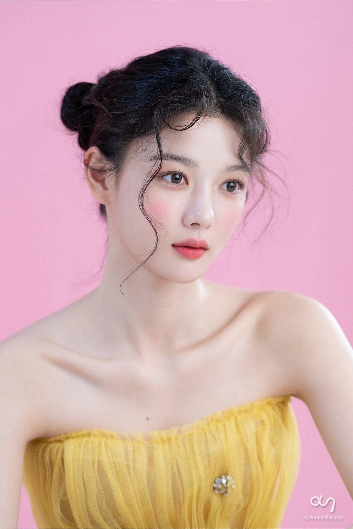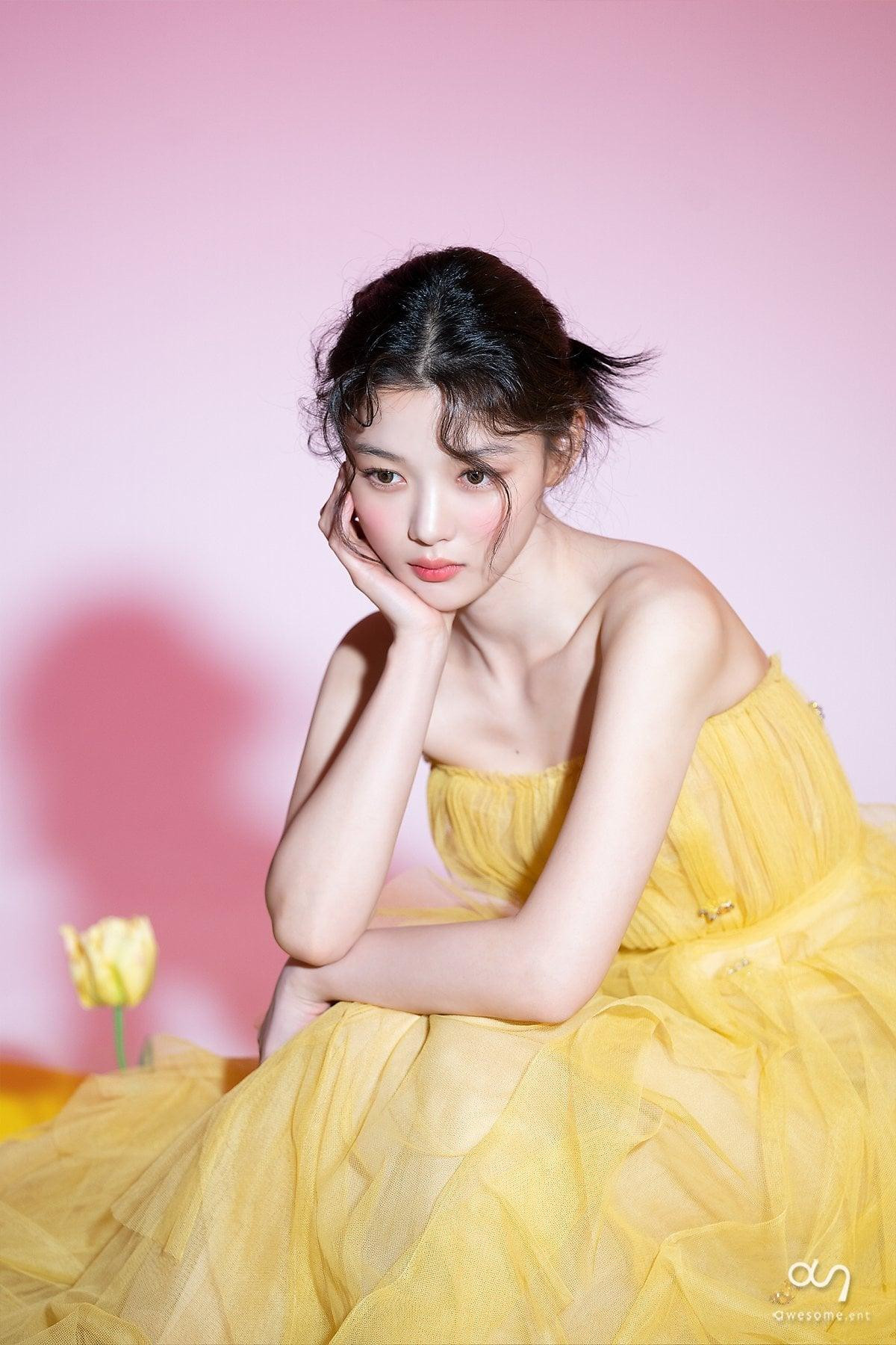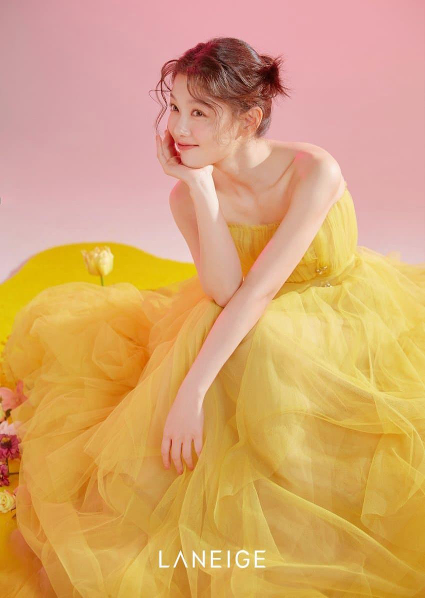 Kim Yoo Jung diện chiếc váy vàng, nhẹ nhàng bồng bềnh như một áng mây. Nữ diễn viên trẻ khoe nhan sắc trong trẻo, ngọt ngào cùng bờ vai nhỏ nhắn. Ai cũng phải xuýt xoa trước làn da trắng mịn và đẹp đến hoàn hảo của Yoo Jung.