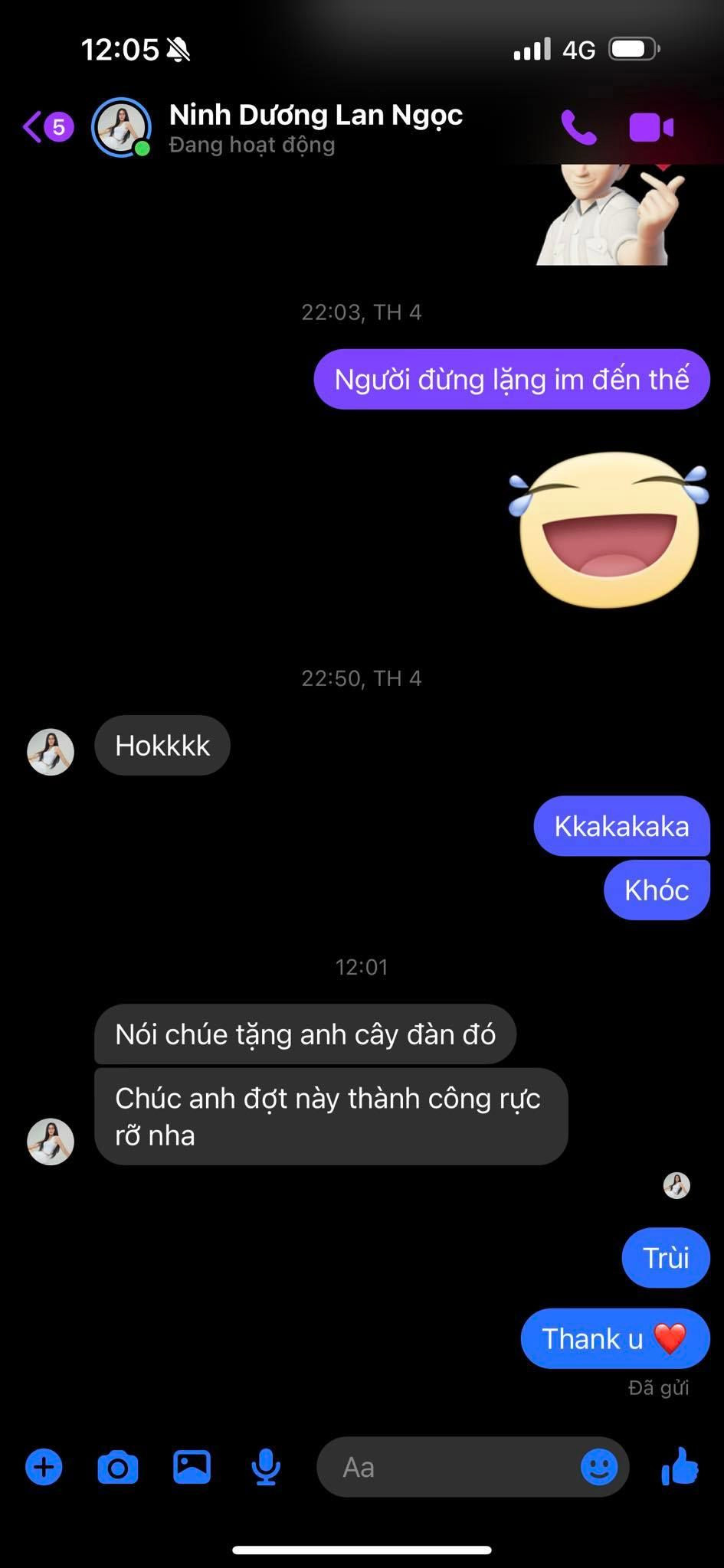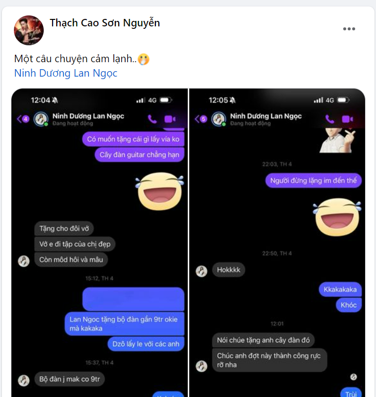 Mới đây, trên trang cá nhân, "anh tài" S.T Sơn Thạch đã đăng tải dòng trạng thái cảm ơn tình cảm từ "chị đẹp" Ninh Dương Lan Ngọc khi anh tham gia chương trình Anh Trai Vượt Ngàn Chông Gai. Cụ thể, nam ca sĩ đã chia sẻ ảnh đoạn tin nhắn anh miệt mài đi... "xin vía" Lan Ngọc cùng dòng trạng thái: "Chị đẹp Ninh Dương Lan Ngọc nhả vía thành công! Love you my friend!".