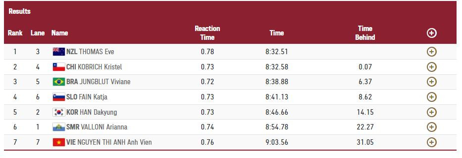 Thành tích này của Ánh Viên kém người dẫn đầu Eve Thomas đến 31.05 giây và thua xa chuẩn B mà Ánh Viên đã đạt được ở SEA Games 2019 (8 phút 48 giây 65). Ở nội dung này, thành tích tốt nhất sự nghiệp của Ánh Viên là 8 phút 34 giây 85. Đây cũng không phải là nội dung sở trường của kình ngư quê Cần Thơ.