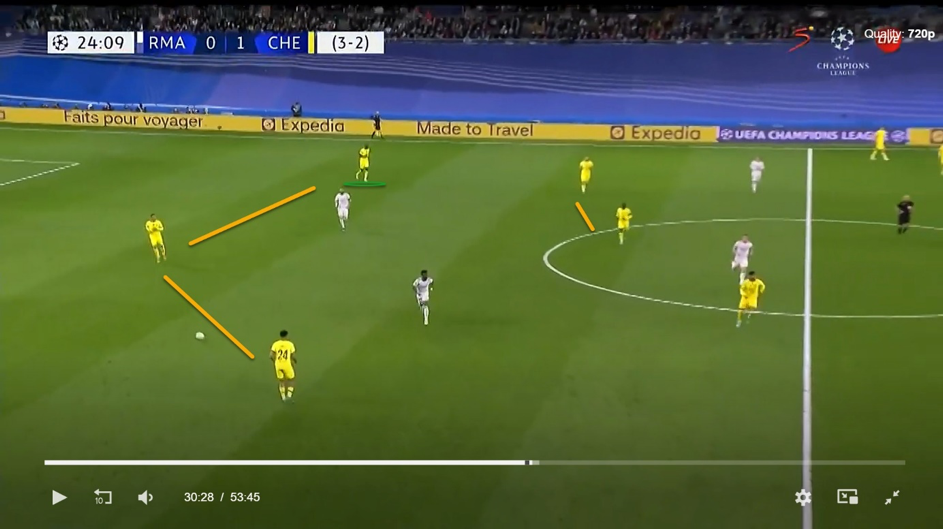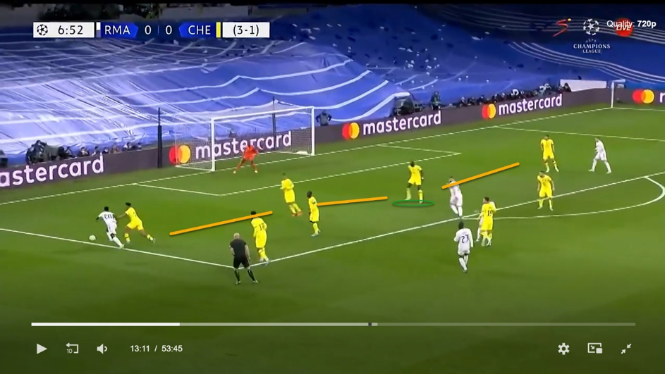 Còn khi không có bóng, Rudiger hoàn toàn có thể lui về chơi như một trung vệ lệch trái trong một hàng thủ 4 người, ví dụ như trong khối đội hình 4-2-2-2 khi phòng ngự của Chelsea ở trận tứ kết lượt về Champions League với Real Madrid. Đó là một trận đấu mà hậu vệ người Đức thi đấu rất hay khi được đá cặp với một trung vệ có khả năng bọc lót tốt là Thiago Silva.