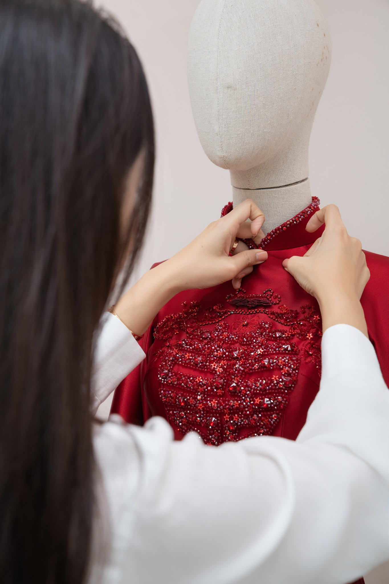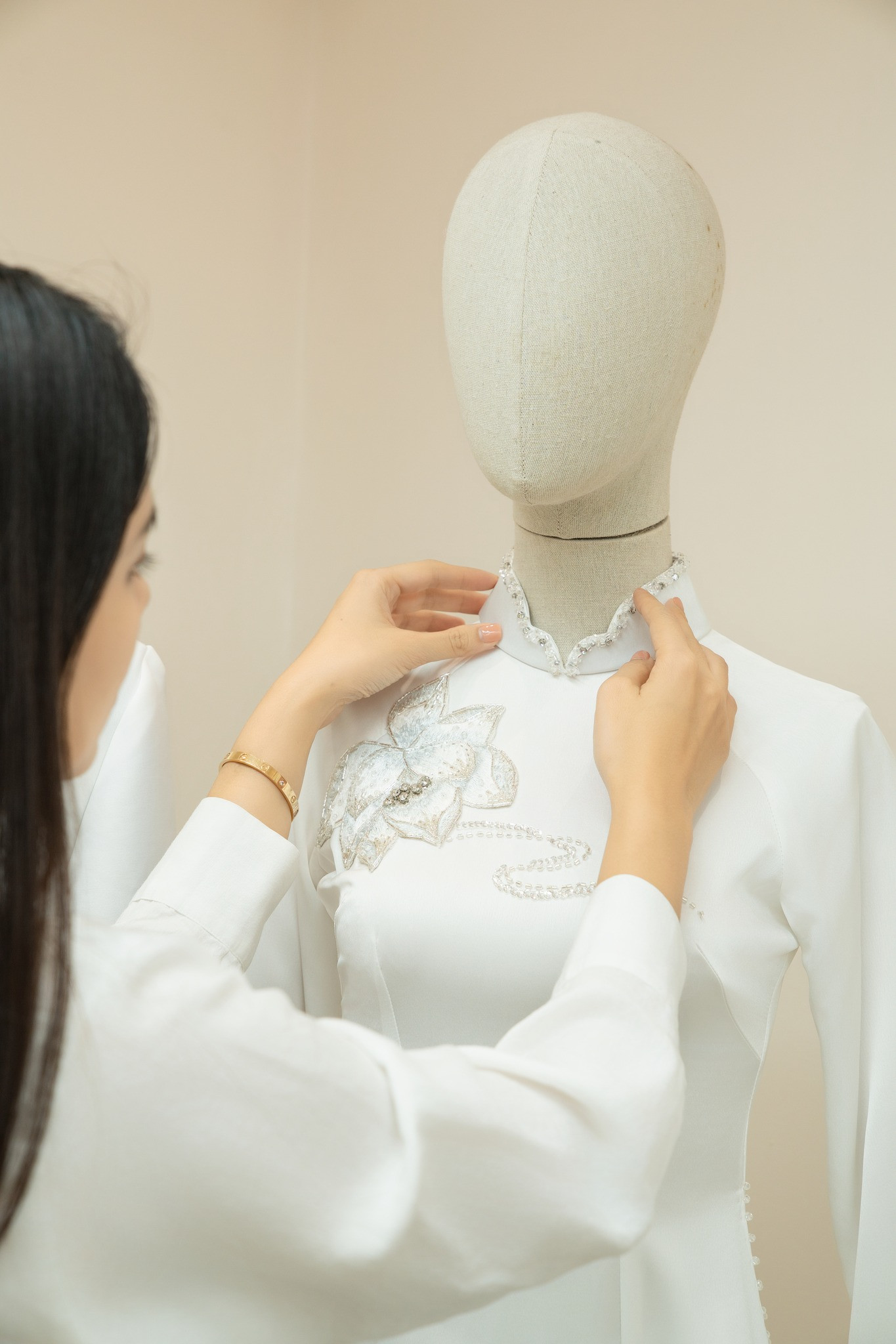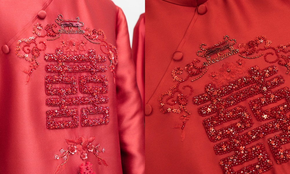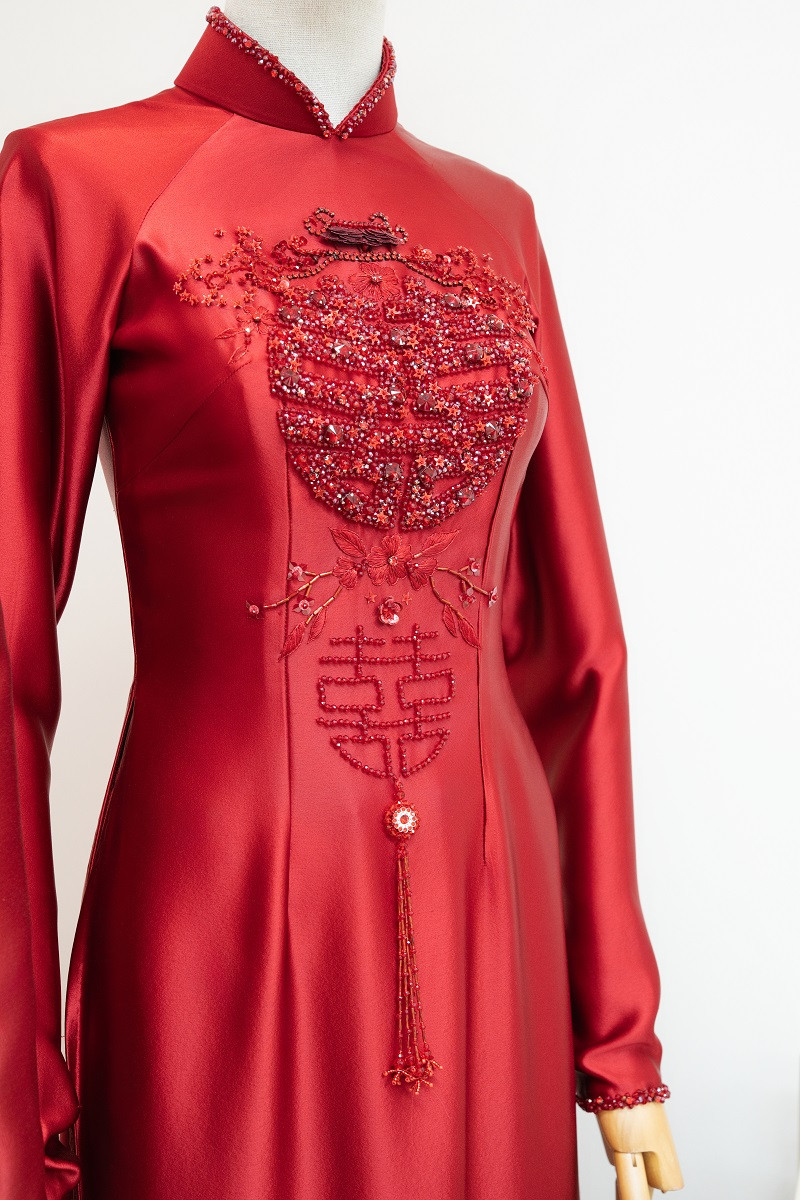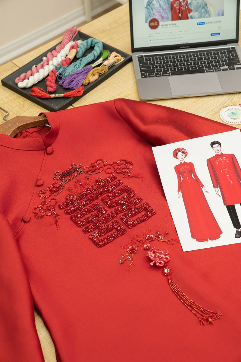 NTK Hà Cúc tiết lộ hai bộ áo dài đặc biệt này mất tới hai tháng để hoàn thiện. Toàn bộ chi tiết thêu hay đính kết trên thân áo đều được các nghệ nhân làm thủ công nên nhìn vô cùng mềm mại, tinh xảo, càng tôn lên diện mạo sáng bừng của cô dâu chú rể.