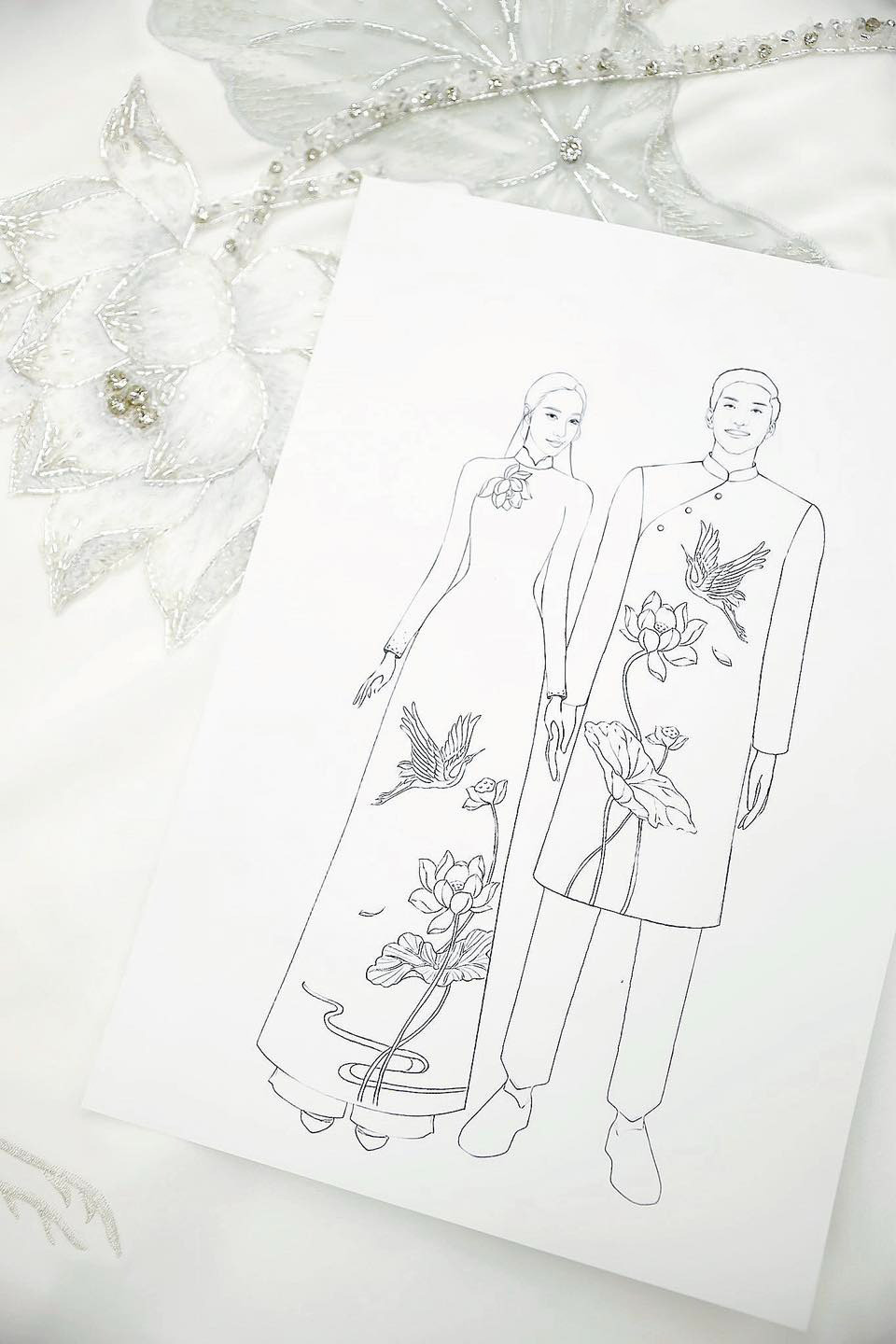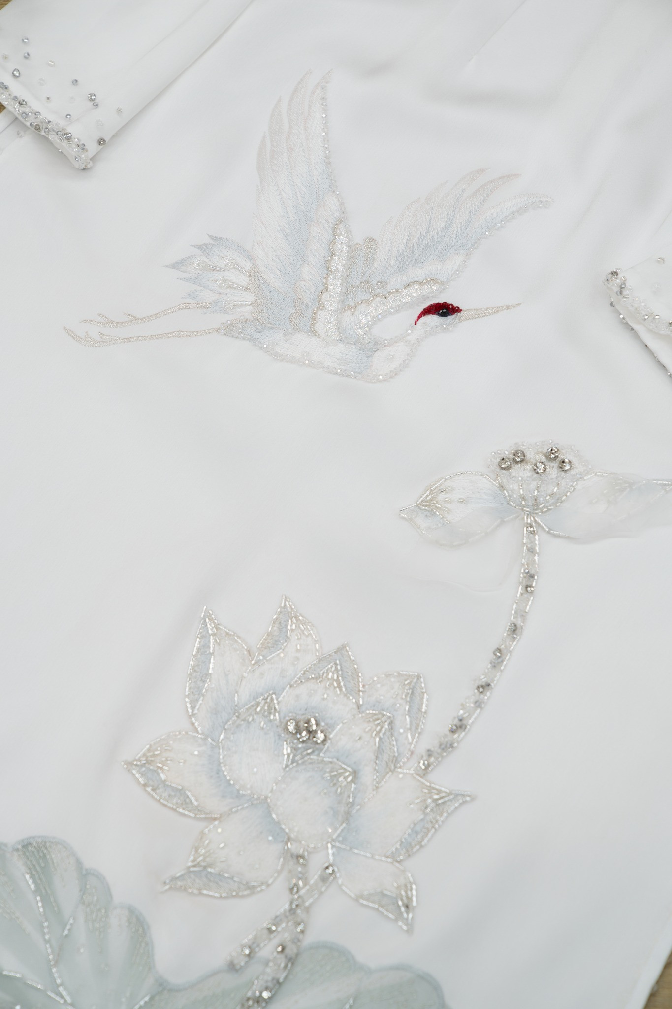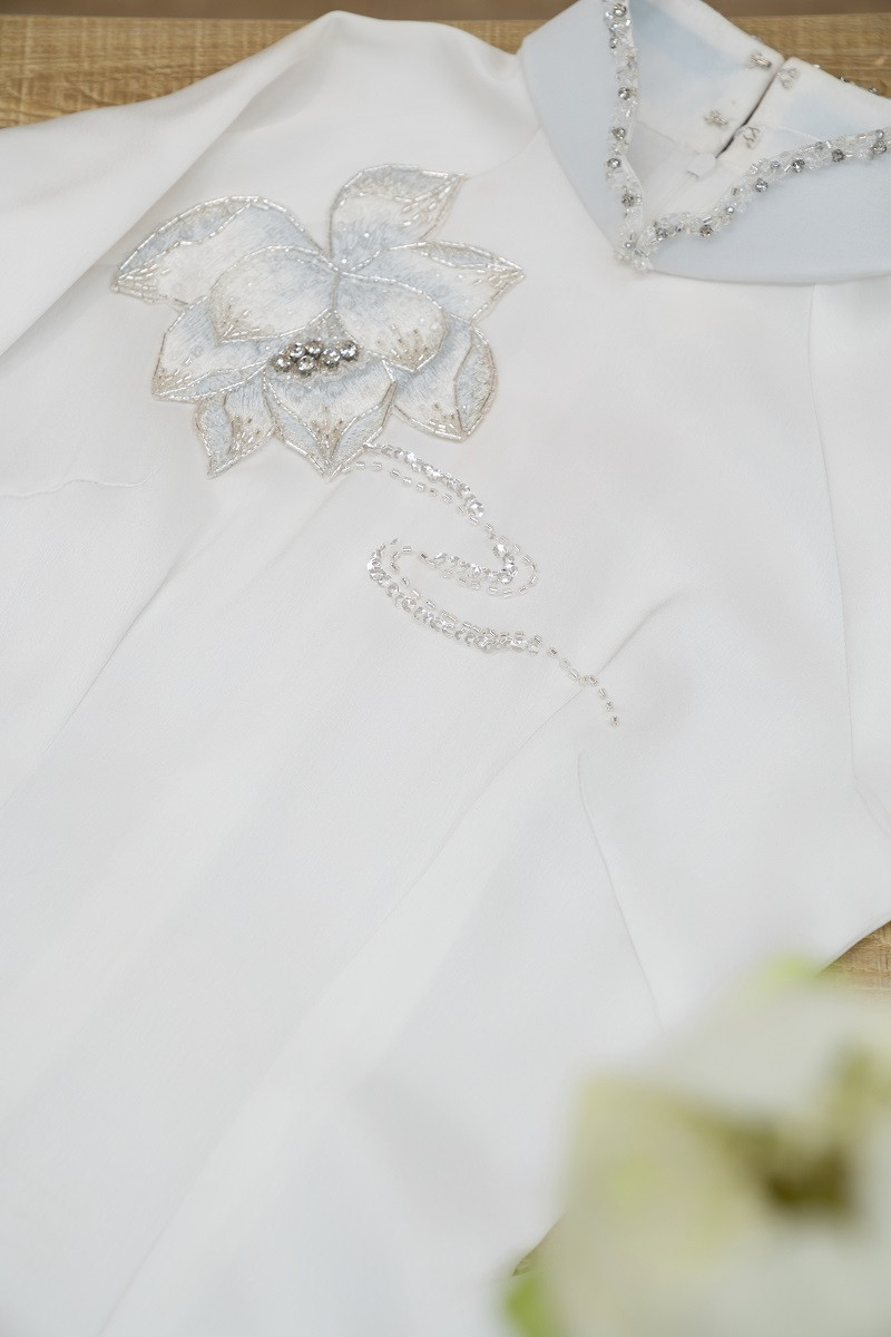 Ngoài ra, Đoàn Văn Hậu và Doãn Hải My còn mặc thêm bộ áo dài trắng có tên Bạch Hạc Liên Hương. Thiết kế có chi tiết hoa sen cùng chim hạc, đều là những hình ảnh ẩn chứa lời chúc nhiều điều may mắn, an yên và lâu bền đến cặp đôi.