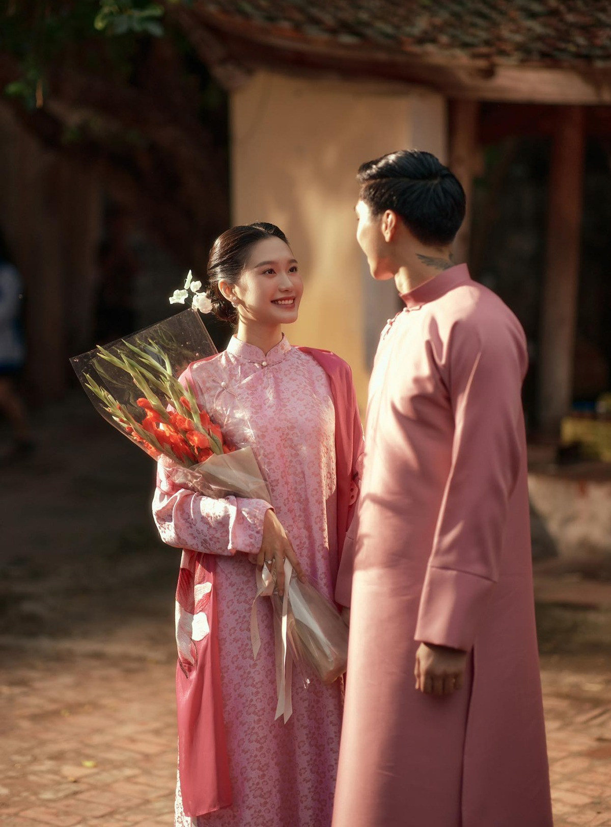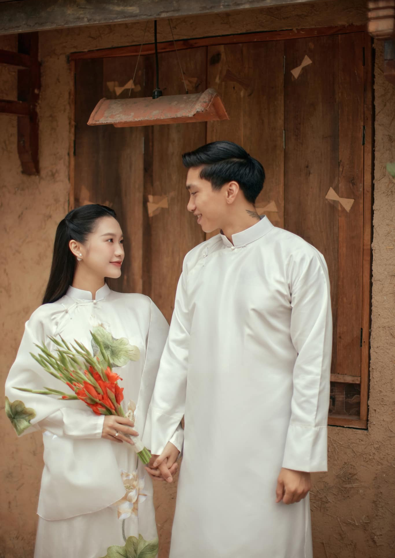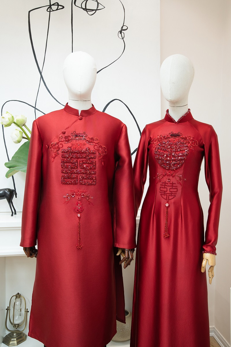Đoàn Văn Hậu và Doãn Hải My chọn màu đỏ truyền thống cho bộ áo dài quan trọng nhất khi làm lễ ăn hỏi. Cả hai chiếc áo đều có họa tiết mái nhà, thêu đính chữ hỷ, tượng trưng cho mái ấm ngọt ngào, hạnh phúc của cặp đôi.