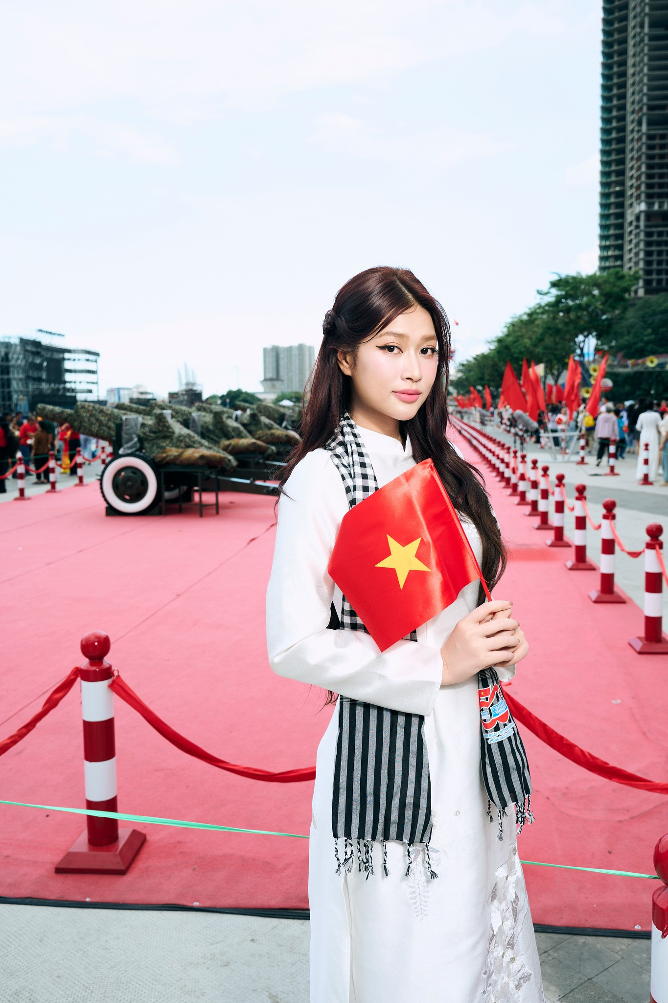 Còn Hoa hậu Thanh Thủy thì lại thích mặc áo dài trắng có thêm chi tiết đính kim sa hình đám mây, vừa đủ tạo điểm nhấn mà vẫn tinh tế, lịch sự. Ngay sau khi tham gia lễ diễu binh, diễu hành sáng 30/4, Hoa hậu Thanh Thủy đã bay sang Indonesia thực hiện lịch trình của đương kim Miss International.