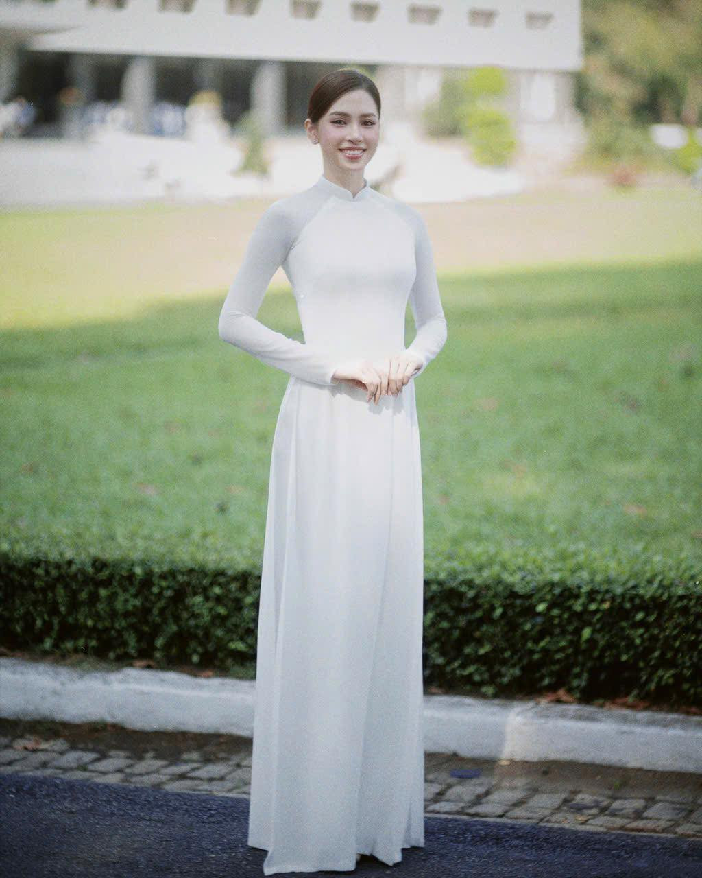 Hoa hậu Lương Thùy Linh cũng chọn áo dài trắng thanh thuần không họa tiết hay chi tiết gì thêm. Nàng hậu còn không quên cầm theo chiếc nón, vừa là món phụ kiện đặc trưng của phụ nữ Việt Nam, vừa đi cùng áo dài cực kỳ hợp.