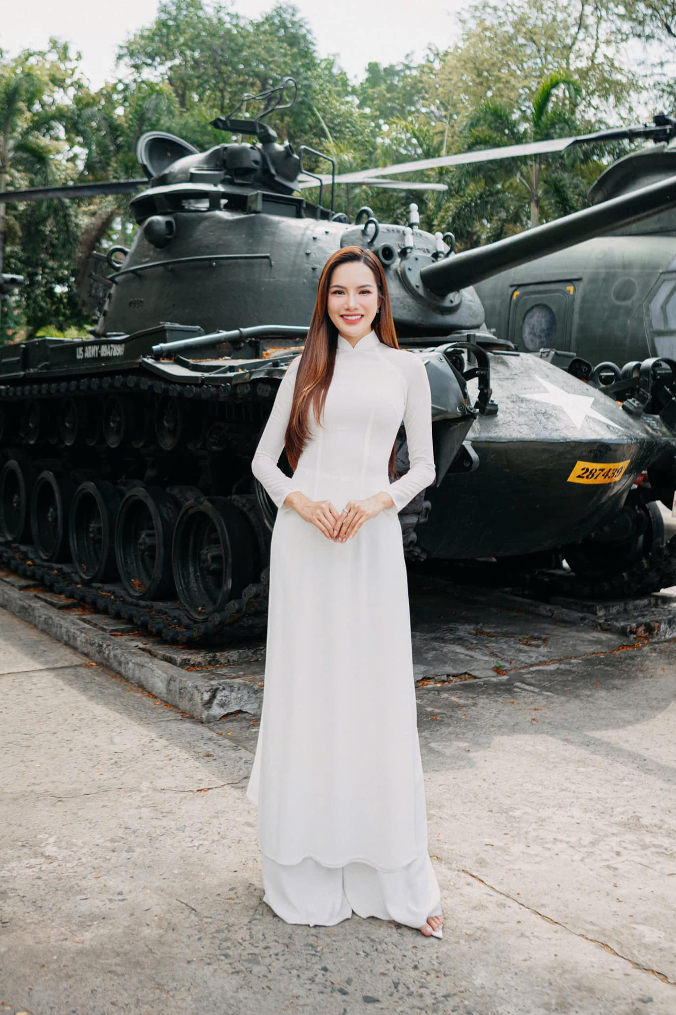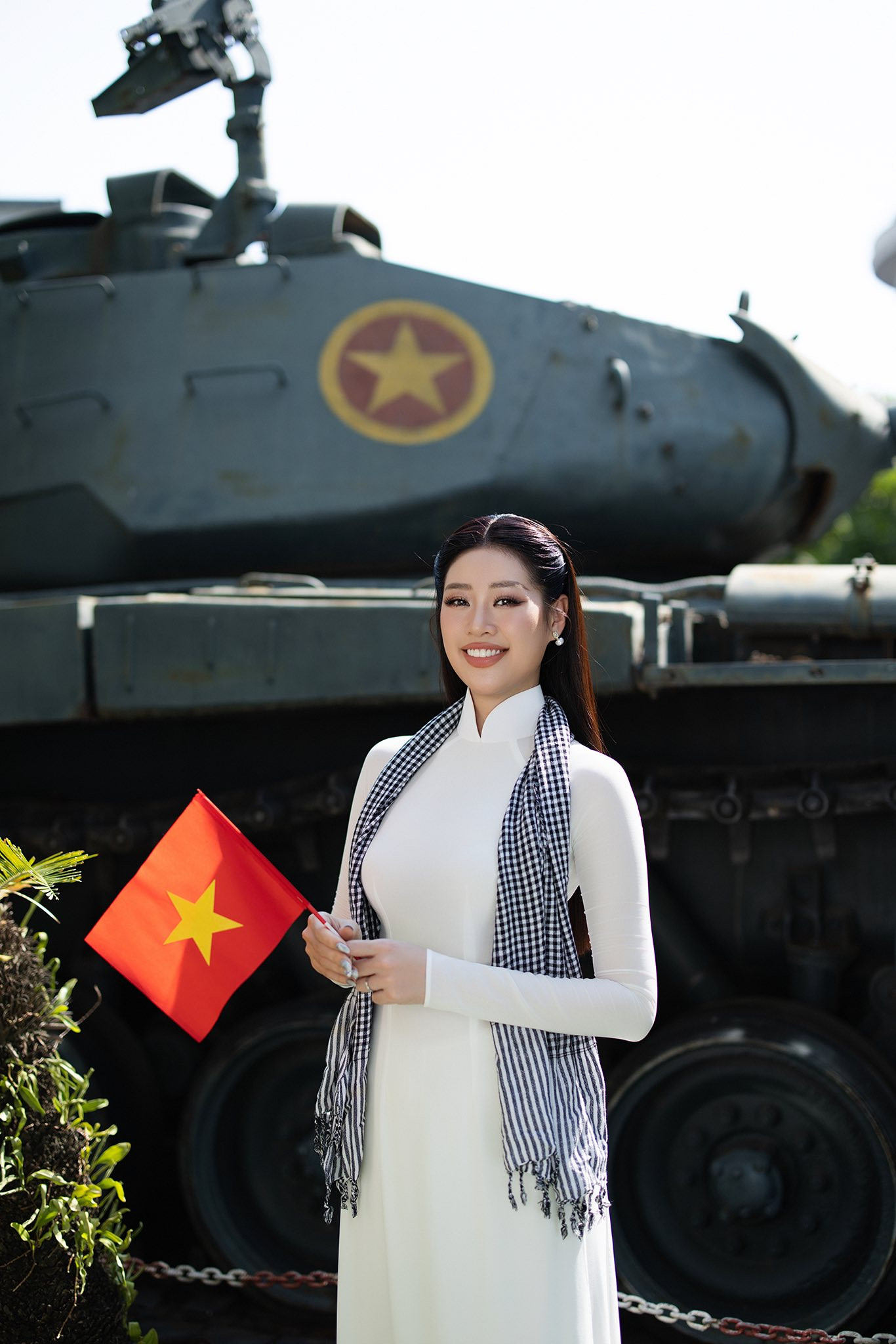 Trong dịp kỷ niệm 50 năm Ngày Giải phóng miền Nam, thống nhất đất nước, rất nhiều Hoa - Á hậu Việt đã chọn áo dài trắng tinh khôi để chụp bộ ảnh kỷ niệm thời khắc đặc biệt này. Hoa hậu Tiểu Vy được khen dịu dàng đúng chuẩn người con gái Việt Nam trong tà áo dài mềm mại, búi tóc gọn gàng.