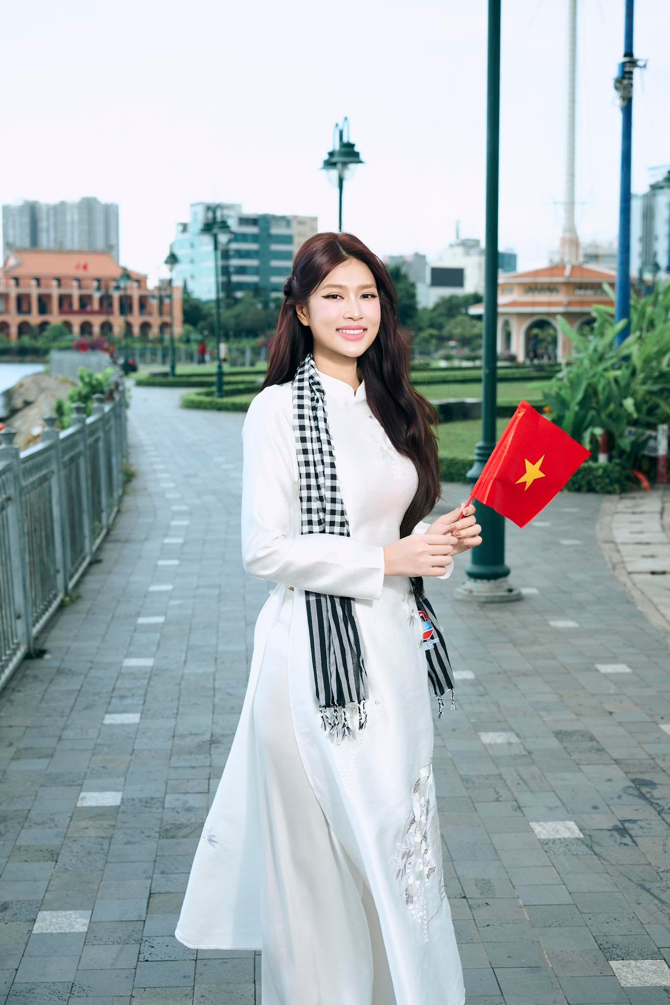 Hoa hậu Đoàn Thiên Ân lại chọn áo dài thêu chỉ trắng đầy trang nhã. Cô còn quàng thêm khăn rằn, cầm lá cờ Tổ quốc để có được tạo hình đậm nét Việt Nam cho bộ ảnh đầy ý nghĩa này.