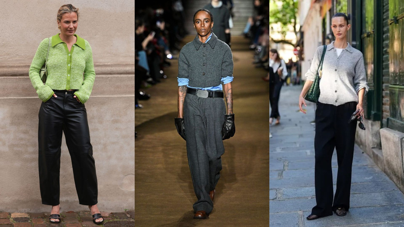 Phối áo khoác cardigan cùng áo có cổ và quần âu ống rộng