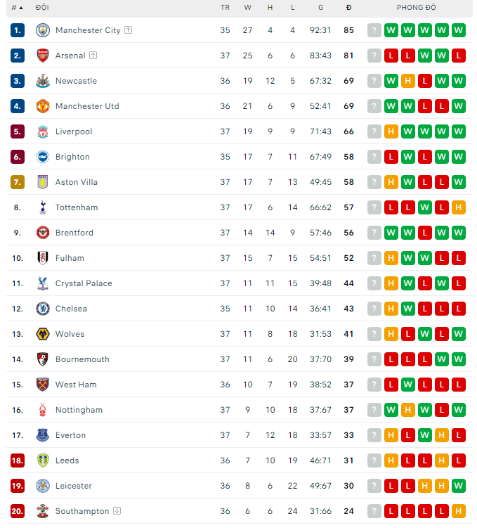 Bảng xếp hạng Ngoại hạng Anh mới nhất