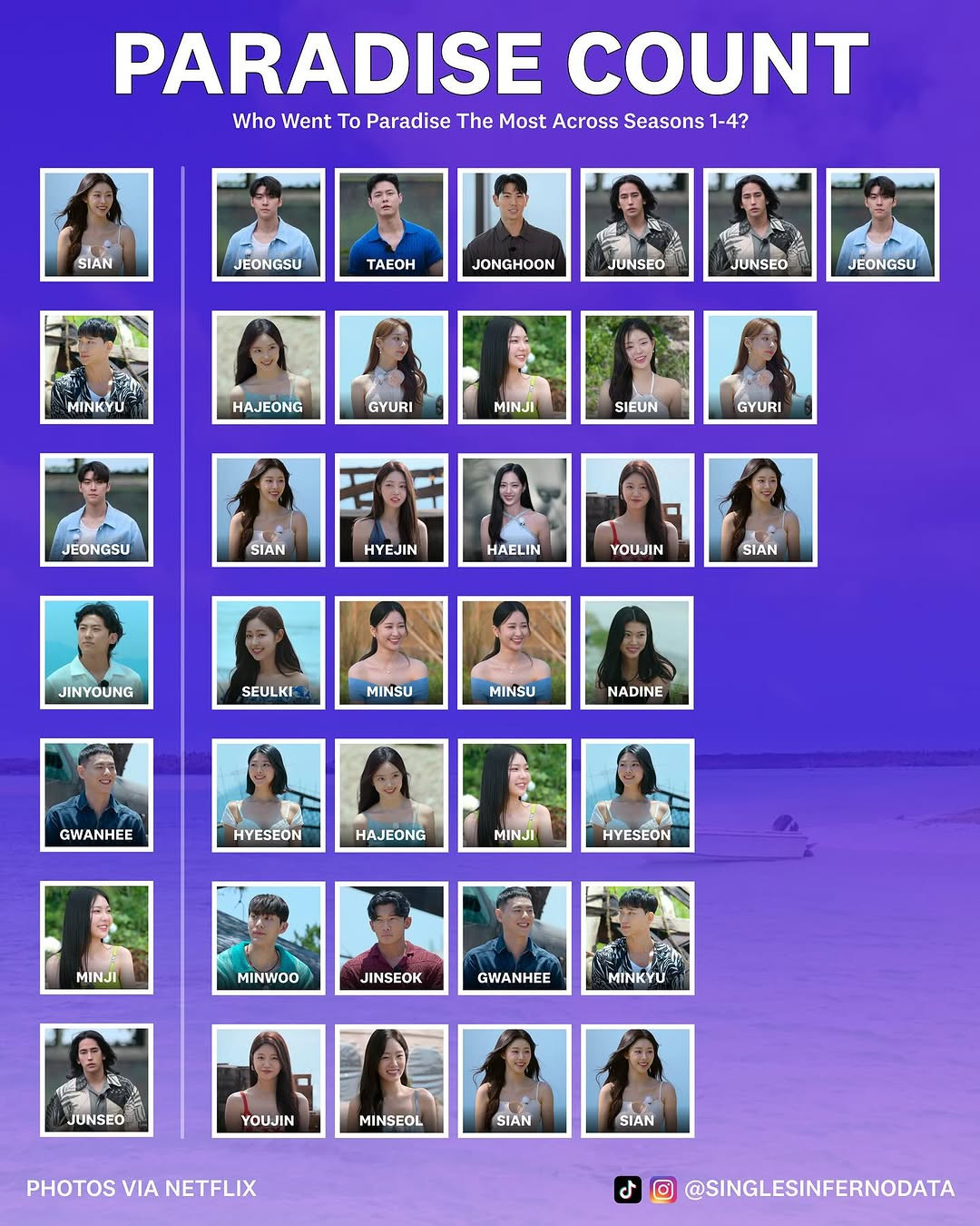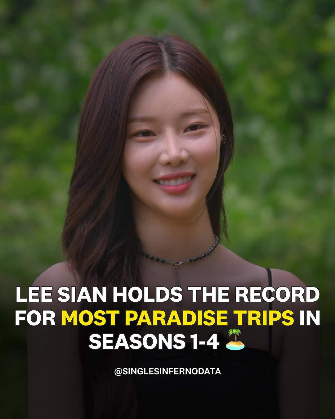 Số lần đi hẹn hò trên Đảo Thiên Đường của Lee Si An không chỉ dẫn đầu dàn cast mùa 4 mà còn phá vỡ kỷ lục suốt 4 mùa phát sóng của Địa Ngục Độc Thân. Ở vị trí số 2 trong bảng xếp hạng này là Jeong Su (mùa 4) và Min Kyu (mùa 3) với 5 lần tới Đảo Thiên Đường.