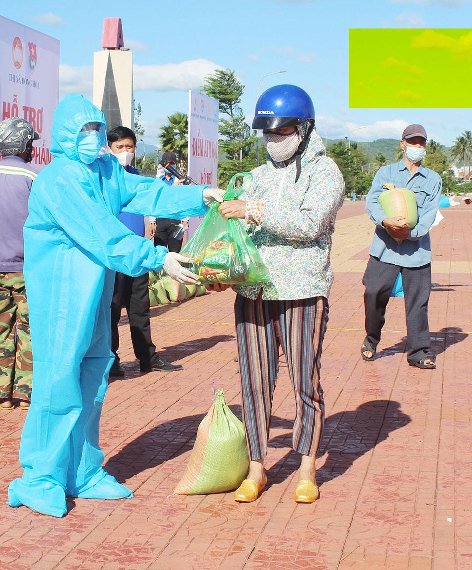 | Bình quân mỗi người dân sẽ được nhận 10kg gạo/lần. Ngoài ra mỗi hộ dân được nhận thêm một phần quà gồm các nhu yếu phầm cần thiết như khẩu trang y tế, dầu ăn… trị giá 150.000 đồng/suất do Ủy ban MTTQ Việt Nam TX Đông Hòa và Thị Đoàn Đông Hòa hỗ trợ |