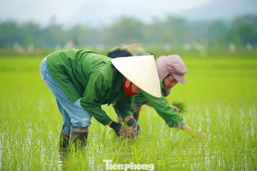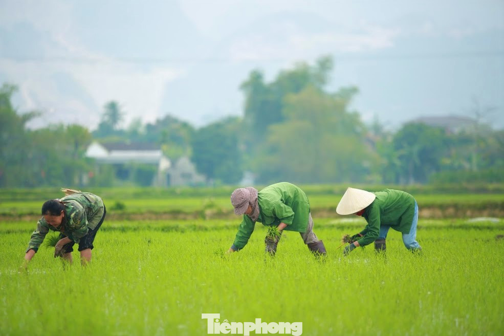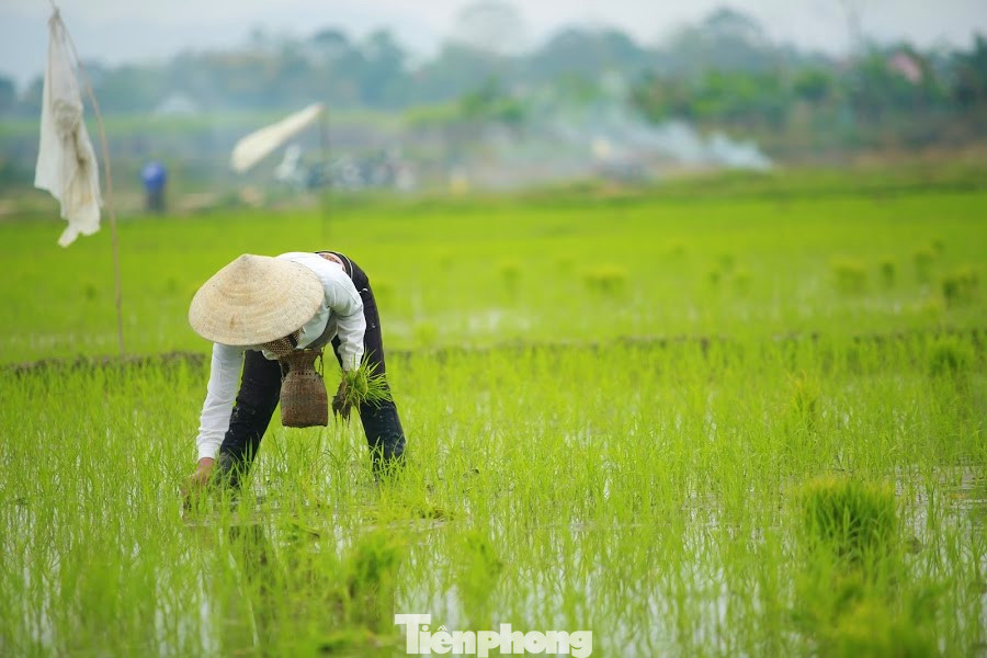 Thời tiết nắng ấm nên mọi người đều tranh thủ ra cấy lúa đầu xuân cho kịp thời vụ.