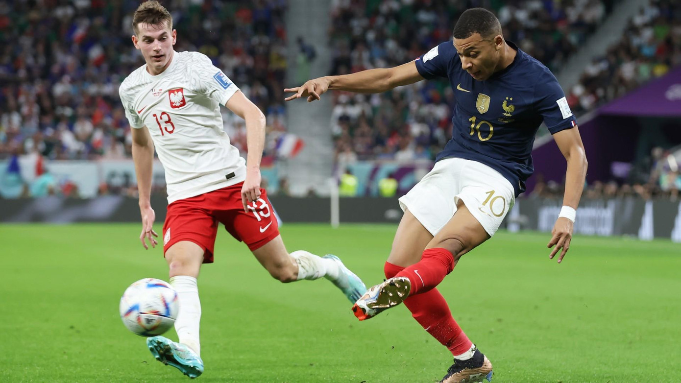 45': Mbappe chiếm được khoảng không gian bên góc trái. Anh ngoặt bóng mở góc sút. Một lần nữa, thủ môn tuyển Ba Lan đã chiến thắng.