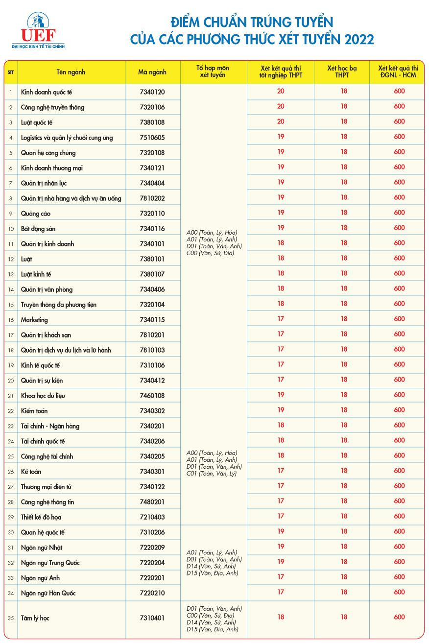 Tượng tự, Hội đồng tuyển sinh Trường ĐH Kinh tế - Tài chính TPHCM (UEF) cũng đã công bố điểm chuẩn trúng tuyển theo phương thức xét kết quả tốt nghiệp THPT, kết quả xét học bạ, kết quả thi đánh giá năng lực 2022 của 35 ngành đào tạo trình độ đại học chính quy.