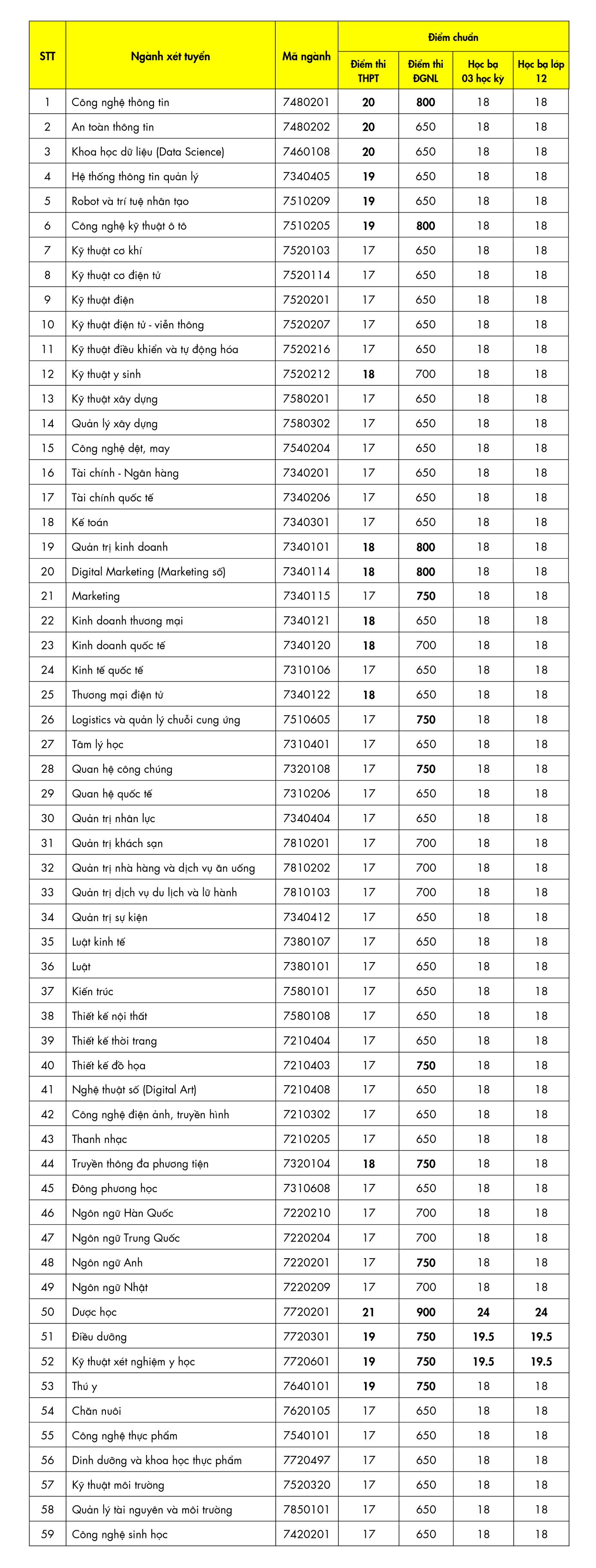 Các ngành Quan hệ quốc tế, Logistics và quản lý chuỗi cung ứng, Ngôn ngữ Trung Quốc, Ngôn ngữ Nhật, Quan hệ công chúng, Kinh doanh thương mại, Quản trị nhân lực, Khoa học dữ liệu, Quản trị nhà hàng và dịch vụ ăn uống, Quảng cáo, Bất động sản, Kiểm toán có mức điểm trúng tuyển là 19. Các ngành còn lại dao động từ 17 - 18 điểm.