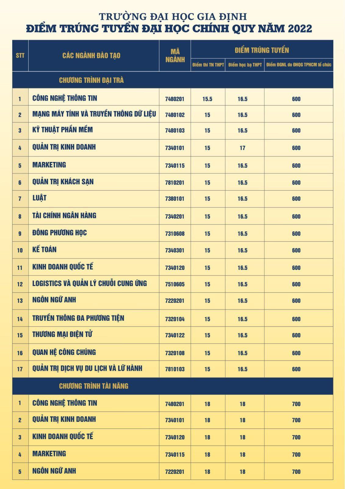 Hội đồng tuyển sinh Trường ĐH Gia Định (GDU) công bố điểm chuẩn trúng tuyển Đại học chính quy năm 2022 đối với 17 ngành chương trình đại trà và 05 ngành chương trình tài năng.