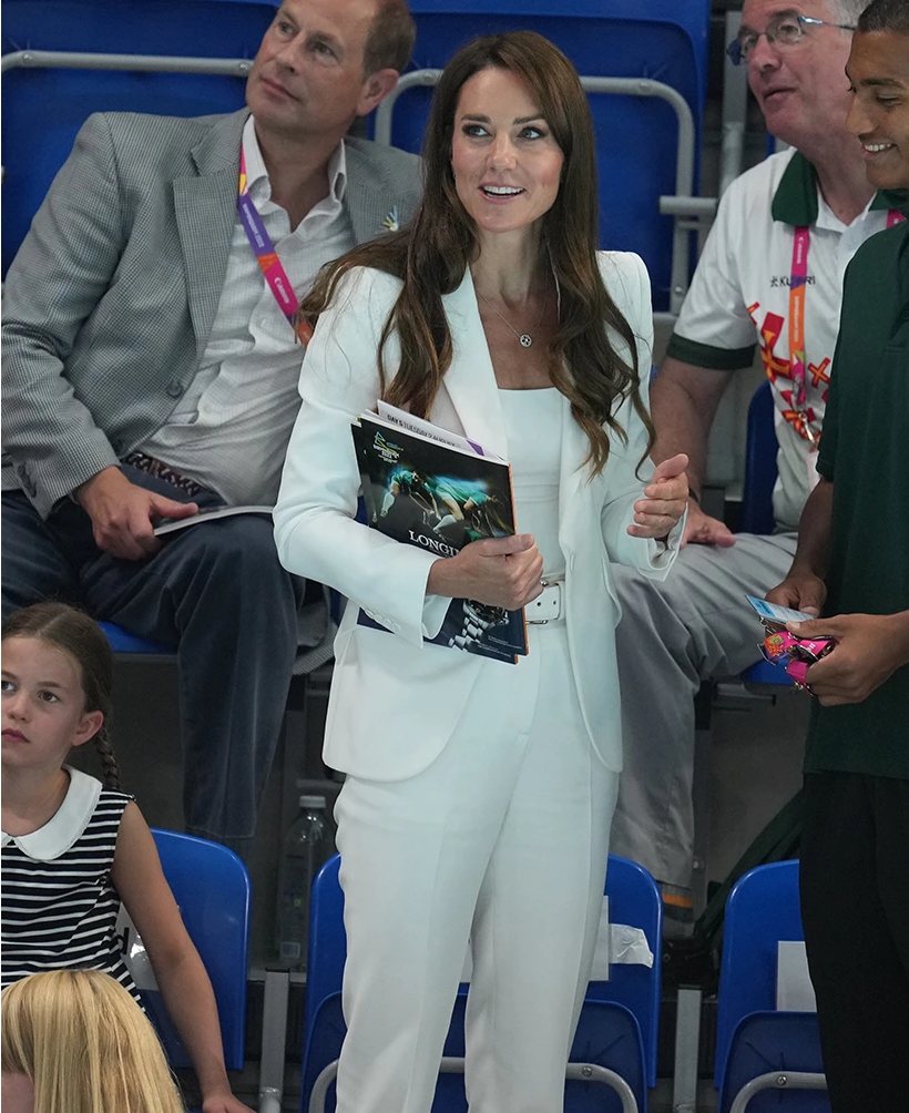 Chiếc vest Alexander McQueen màu trắng này nhanh chóng trở thành một trong những trang phục ưa thích của Kate trong năm 2022. Lần đầu tiên cô mặc nó với sơ mi tạo điểm nhấn màu cam trong chuyến công du vùng Caribê cùng Hoàng tử William vào tháng 3.