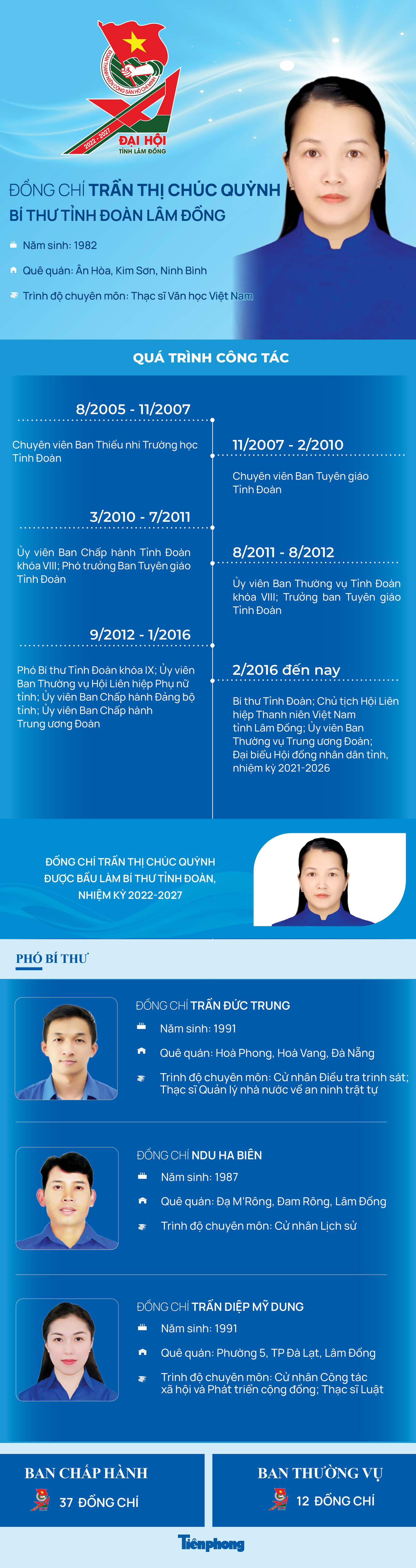 TPO - Đại hội Đại biểu Đoàn TNCS Hồ Chí Minh tỉnh Lâm Đồng lần thứ XI nhiệm kỳ 2022 - 2027 đã bầu Ban Chấp hành gồm 37 ủy viên. Chị Trần Thị Chúc Quỳnh tái đắc cử Bí thư Tỉnh Đoàn Lâm Đồng. Các anh Trần Đức Trung, Ndu Ha Biên và chị Trần Diệp Mỹ Dung tái đắc cử Phó Bí thư Tỉnh Đoàn.