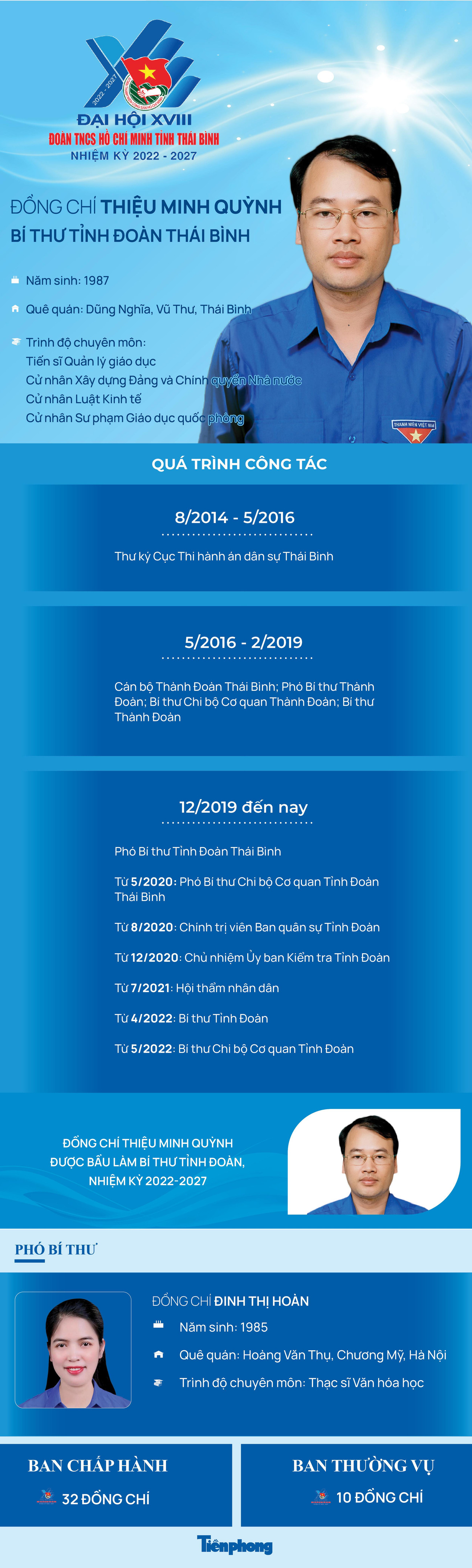 TPO - Tại phiên làm việc thứ hai Đại hội đại biểu Đoàn TNCS Hồ Chí Minh tỉnh Thái Bình khóa XVIII, nhiệm kỳ 2022-2027, đã bầu ra Ban Chấp hành khóa mới gồm 32 anh, chị. Anh Thiệu Minh Quỳnh – Bí thư Tỉnh Đoàn Thái Bình khóa XVII, tái đắc cử Bí thư Tỉnh Đoàn Thái Bình khóa XVIII, nhiệm kỳ 2022-2027. Chị Đinh Thị Hoàn - Phó Bí thư Tỉnh Đoàn Thái Bình khóa XVII, tái đắc cử Phó Bí thư Tỉnh Đoàn Thái Bình khóa XVIII nhiệm kỳ 2022-2027.
