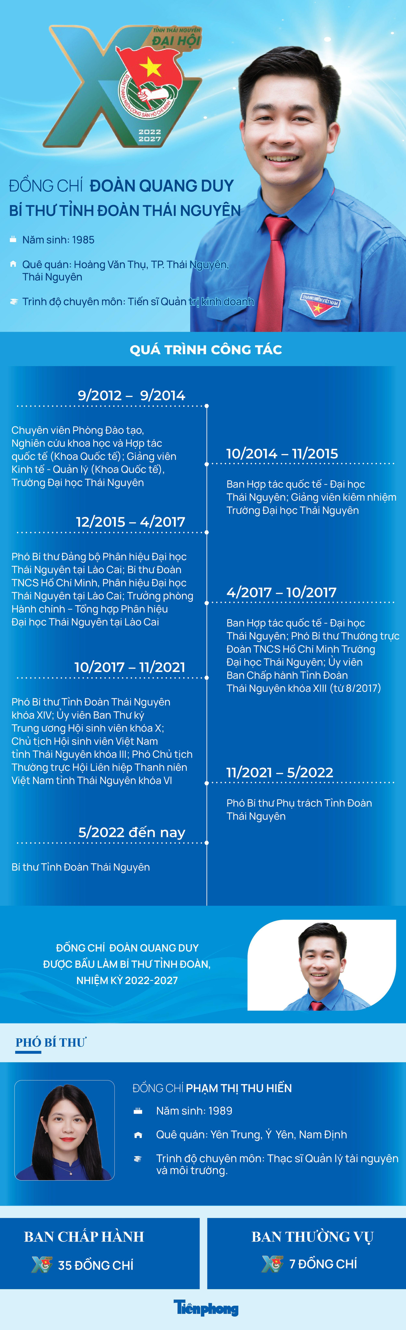 TPO - Đại hội đại biểu Đoàn TNCS Hồ Chí Minh tỉnh Thái Nguyên lần thứ XV nhiệm kỳ 2022 - 2027 bầu Ban Chấp hành Tỉnh Đoàn gồm 35 anh, chị. Anh Đoàn Quang Duy được tín nhiệm bầu làm Bí thư Tỉnh Đoàn Thái Nguyên khóa XV. Chị Phạm Thị Thu Hiền được bầu làm Phó Bí thư Tỉnh Đoàn Thái Nguyên khóa XV.