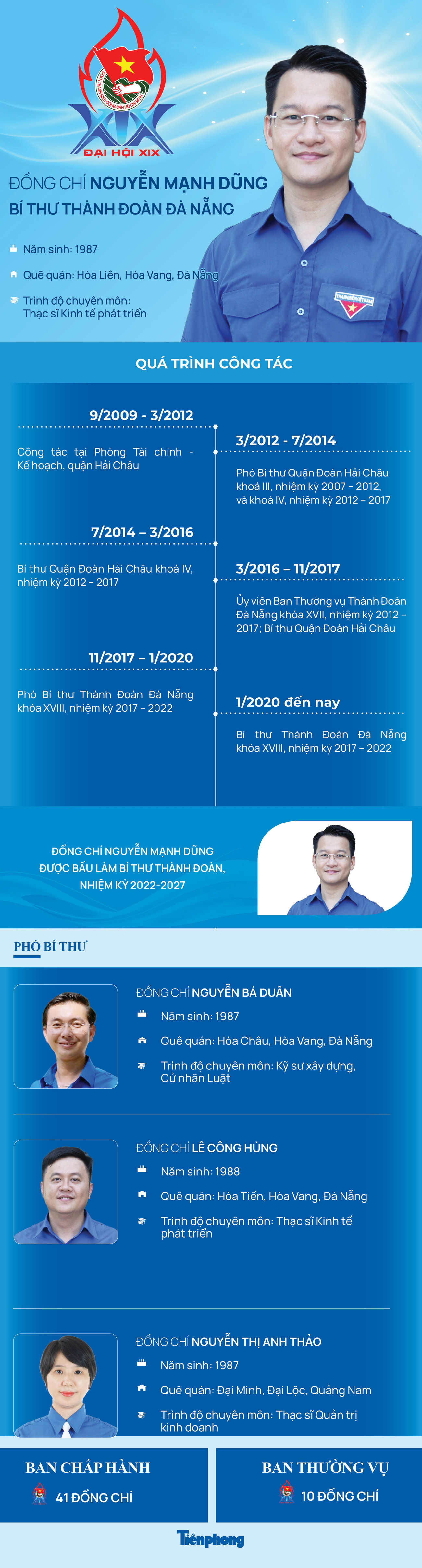 TPO - Ban Chấp hành Đoàn TNCS Hồ Chí Minh TP. Đà Nẵng khoá XIX, nhiệm kỳ 2022 - 2027, gồm 41 anh, chị. Ban Thường vụ gồm 10 anh, chị.