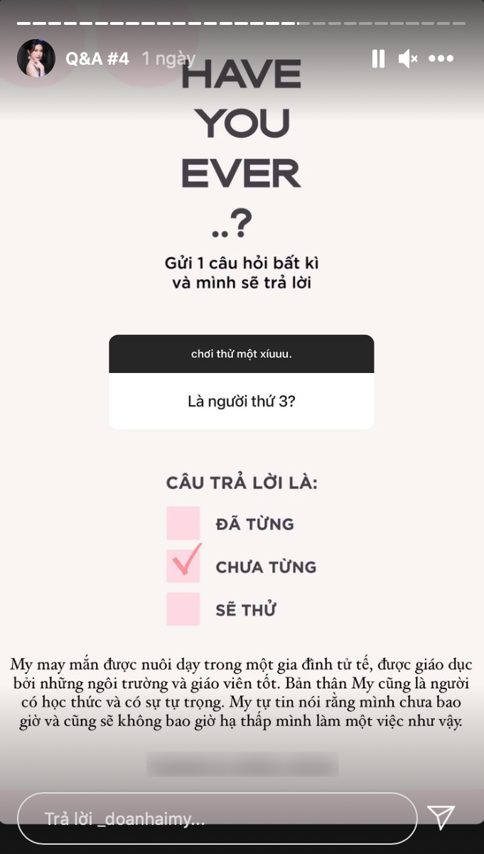 Cô nàng không né tránh chủ đề này mà thẳng thắn đáp trả trên Story. Doãn Hải My khẳng định "chưa từng làm người thứ ba" và giải thích: "My may mắn được nuôi dạy trong một gia đình tử tế, được giáo dục bởi những ngôi trường và giáo viên tốt. Bản thân My cũng là người có học thức và có sự tự trọng. My tự tin nói rằng mình chưa bao giờ và cũng sẽ không bao giờ hạ thấp mình làm một việc như vậy".