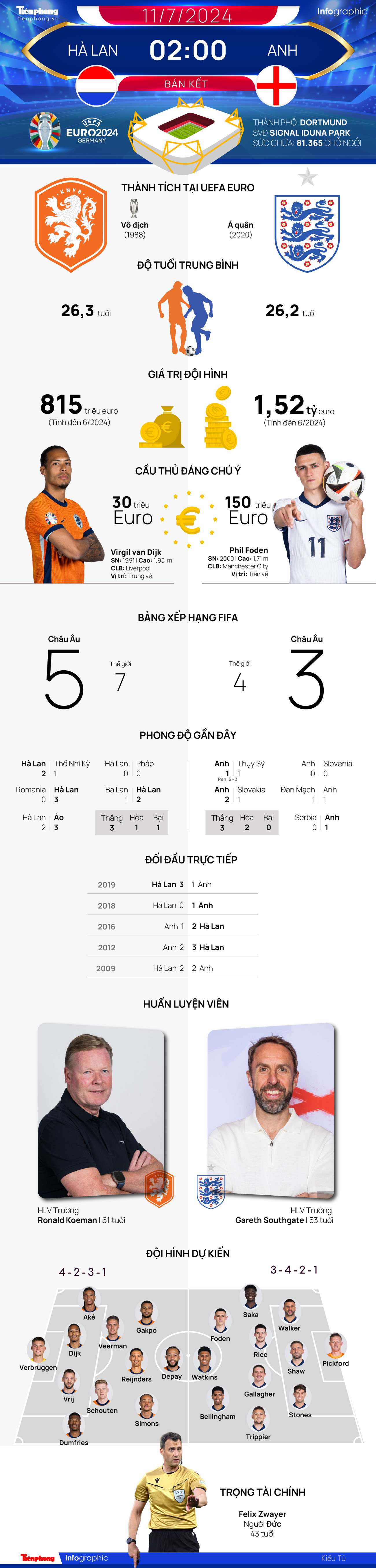 TPO - Trận bán kết 2 EURO 2024 giữa Anh và Hà Lan diễn ra lúc 2 giờ ngày 11/7. Có dàn ngôi sao đắt giá nhưng người hâm mộ chưa thấy bóng dáng một ông lớn của Tam sư. Bên kia chiến tuyến, Hà Lan vào vòng play off với vé vớt, nhưng càng thi đấu “Lốc màu da cam” càng mạnh, đặc biệt trong trận thắng ngược Thổ Nhĩ Kỳ ở tứ kết. Liệu trong trận chiến này Cơn lốc màu da cam có cuốn bay Tam sư?