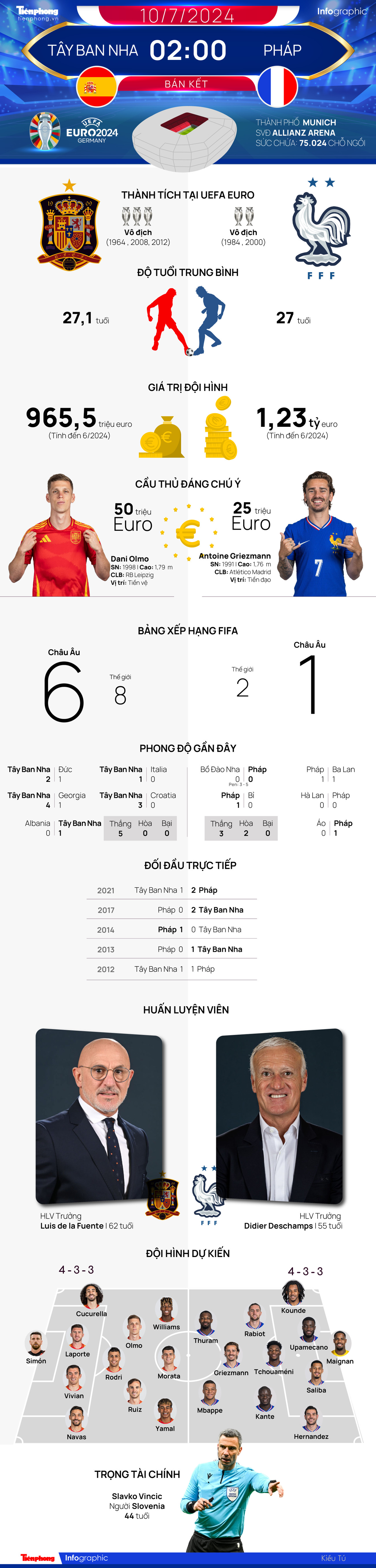 TPO - Bán kết 1 EURO 2024 sẽ là màn tranh đấu giữa Tây Ban Nha và Pháp lúc 2 giờ ngày 10/7. Hàng công của Gà trống Pháp thuộc loại ‘cùn’ nhất nhì giải, dù có nhiều cá nhân đình đám. Bù lại, hàng thủ đã làm tốt nhiệm vụ của mình, họ chỉ để thủng lưới 1 bàn kể từ đầu VCK. Bên kia, Tây Ban Nha đang có phong độ cao, nhưng trong trận đại chiến với Đức, ‘Bò tót’ bị tổn thương khá nặng. Hai hậu vệ chủ chốt, Carvajal và Le Normand bị treo giò. Tiền vệ Pedri phải nghỉ thi đấu do chấn thương đầu gối.