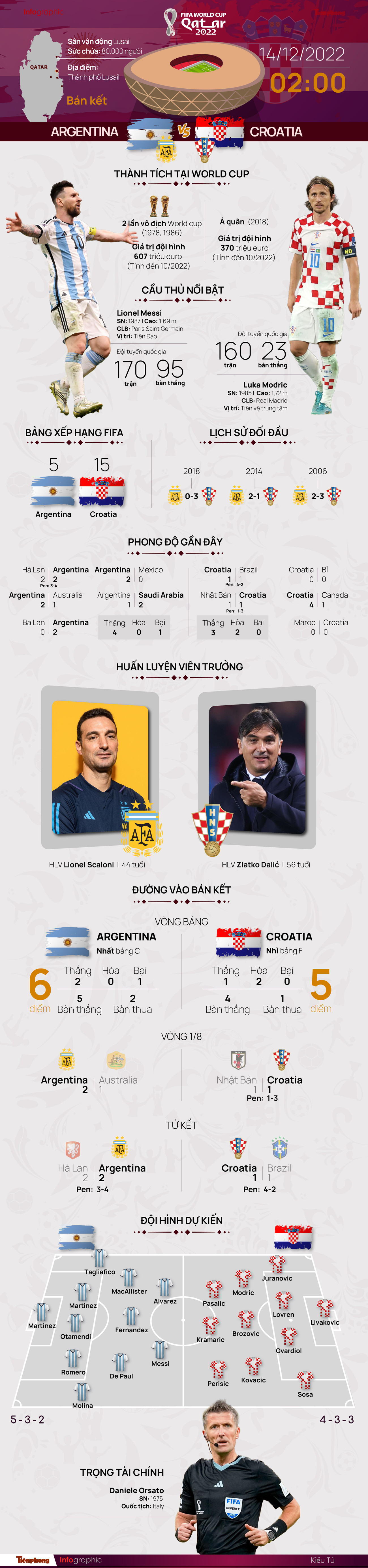 TPO - Trận Bán kết 1 World Cup 2022 sẽ là cuộc đối đầu giữa Argentina và Croatia. Luka Modric cùng các đồng đội đã cho người hâm mộ và đối thủ thấy, không phải tự nhiên họ là Á quân World Cup 2018. Tuy được đánh giá cao hơn, nhưng đội bóng của Messi không thể chủ quan, bởi những gì đoàn quân của HLV Zlatko Dalic đã thể hiện.
