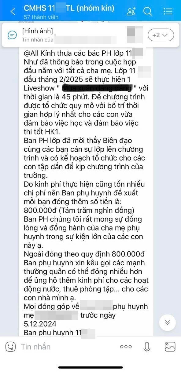 Người này cho biết, cách đây ít ngày, ban phụ huynh lớp đã nhắn trong nhóm lớp về việc đóng tiền cho học sinh tổ chức chương trình biểu diễn trực tiếp với thời gian là 45 phút vào đầu tháng 2/2025.