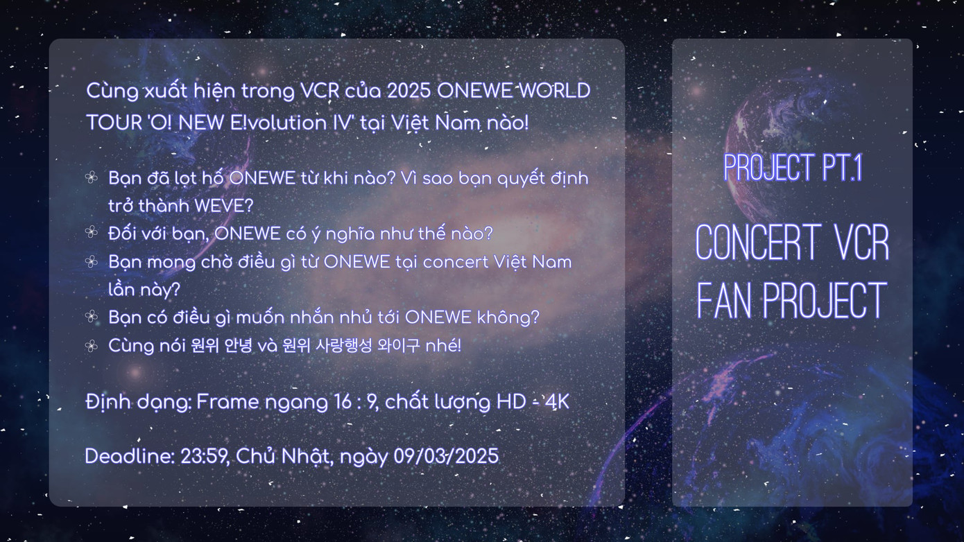 Trước thềm concert, Shine On Us - FC của ONEWE tại Việt Nam đã tung ra project đầu tiên mang tên “Concert VCR Fan Project” kêu gọi các WEVE Việt cùng quay các video ngắn kể về hành trình “lọt hố” ONEWE, cũng như những điều bạn mong chờ tại concert đầu tiên của nhóm tại Việt Nam.