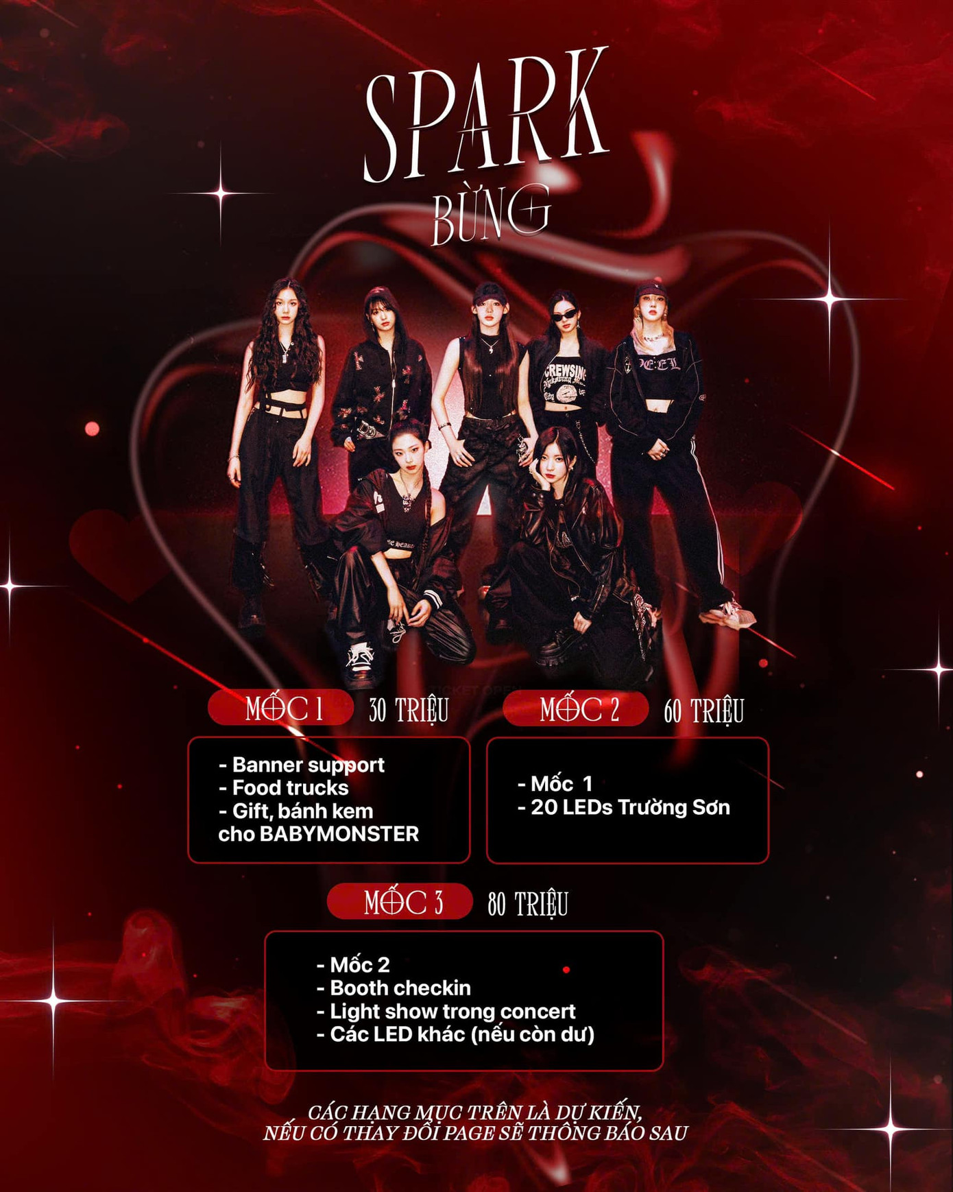 Từ nay cho tới 15/5, quỹ tiếp ứng “Spark” đặt ra 3 cột mốc gồm: 30 triệu - 60 triệu - 80 triệu đồng, tương ứng với các hoạt động như: phát banner, ủng hộ xe tải đồ ăn, quà tặng - bánh kem gửi tới BABYMONSTER; chạy 20 bảng LED trên đường Trường Sơn (TP.HCM); dựng booth check-in, light show trong concert…