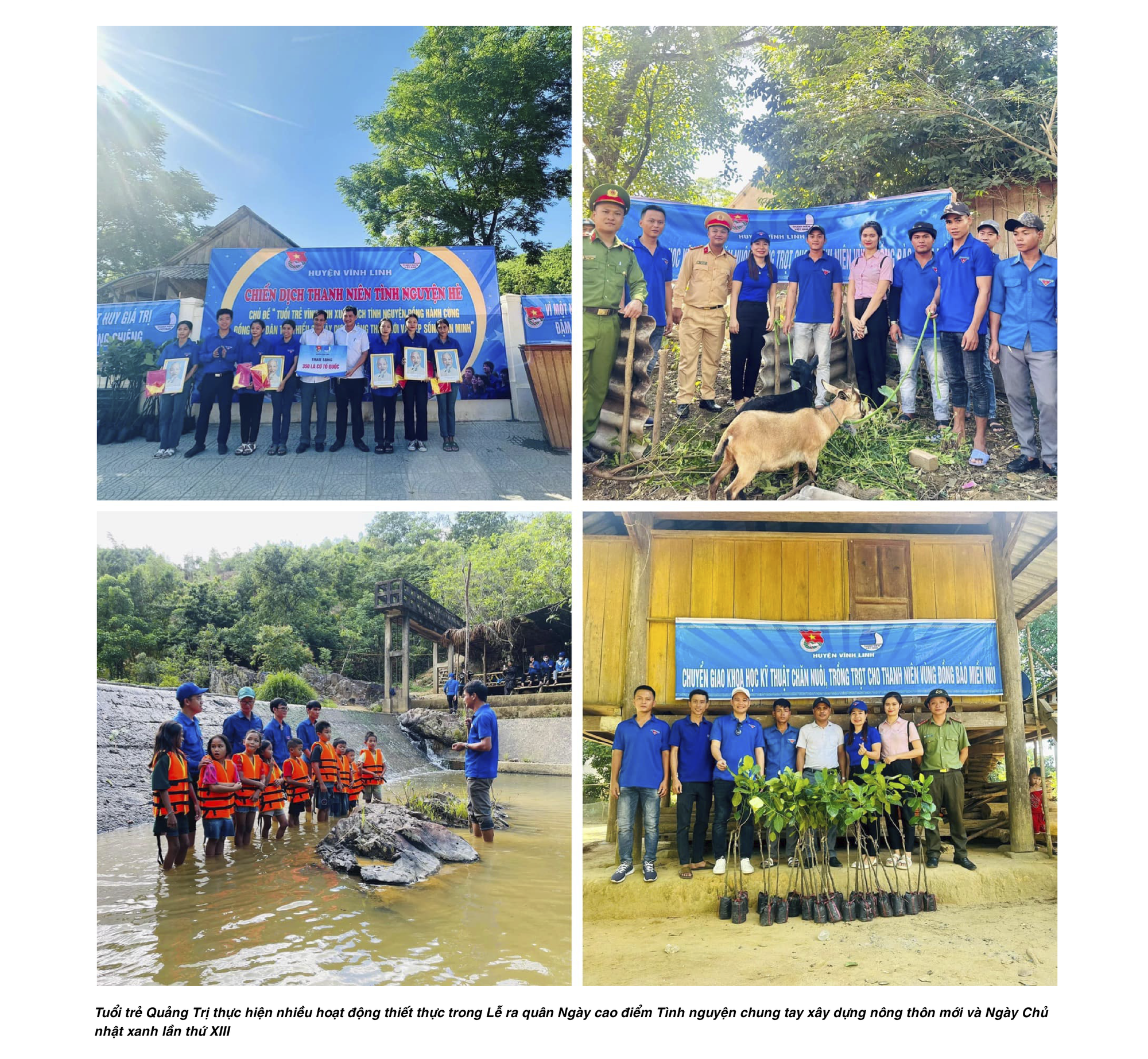 Quảng Trị: Trong ngày cao điểm, Tỉnh Đoàn Quảng Trị cùng các cấp bộ đoàn trong toàn tỉnh đã triển khai xây dựng công trình “Ánh sáng đường quê”; trao tặng 300 lá cờ Tổ quốc xây dựng tuyến đường cờ kiểu mẫu; khai giảng lớp tiếng Anh miễn phí cho trẻ em và; ra quân vệ sinh môi trường, nạo vét kênh mương nội đồng, thành lập các đội hình thanh niên tình nguyện ứng dụng công nghệ sinh học trong bảo vệ môi trường trong xử lý các điểm đen ô nhiễm môi trường, hướng dẫn người dân phân loại rác tại nguồn và xử lý rác sinh hoạt; Đẩy mạnh và nhân rộng các mô hình “Chợ dân sinh, khu dân cư chống rác thải nhựa”,… thu hút gần 10.000 lượt ĐVTN tham gia và đạt được những kết quả tích cực. Thăm và trao tặng 300 suất quà an sinh cho các gia đình có công với cách mạng, cựu thanh niên xung phong; tổ chức nhiều lớp tập huấn chuyển giao khoa học kỹ thuật cho thanh niên khởi nghiệp và người dân; khám, tư vấn sức khoẻ miễn phí cho người dân,...