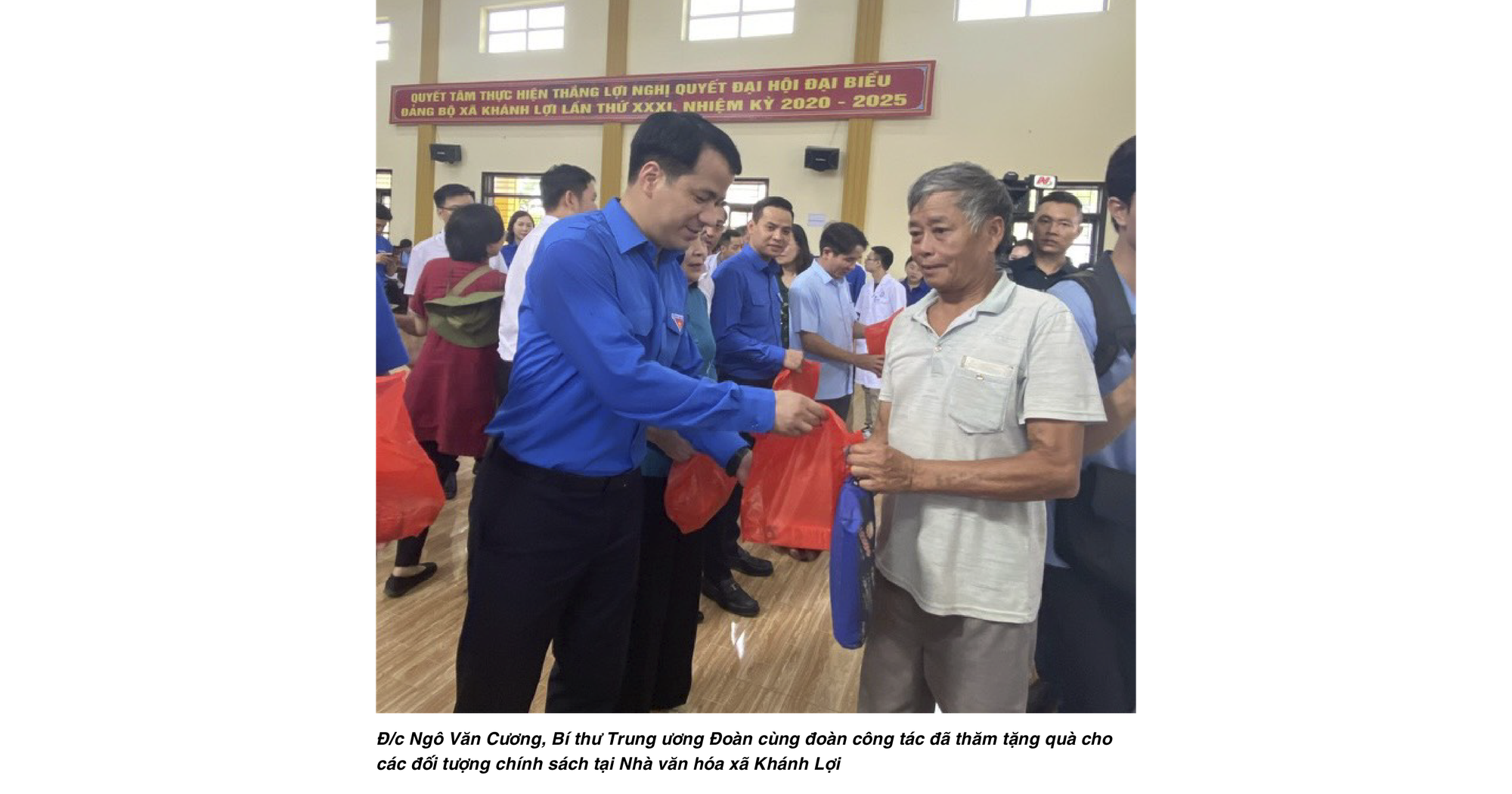 Ngày 23/7, tại Ninh Bình, Đoàn công tác của Trung ương Đoàn do đồng chí Ngô Văn Cương - Bí thư Trung ương Đoàn, Chủ nhiệm UBKT Trung ương Đoàn làm Trưởng đoàn đã kiểm tra công tác triển khai Chiến dịch Thanh niên tình nguyện Hè năm 2023 tại huyện Yên Khánh, tỉnh Ninh Bình. Trong khuôn khổ chương trình, đoàn công tác đã thăm và tặng quà cho các đối tượng chính sách tại xã Khánh Lợi, huyện Yên Khánh, tỉnh Ninh Bình.