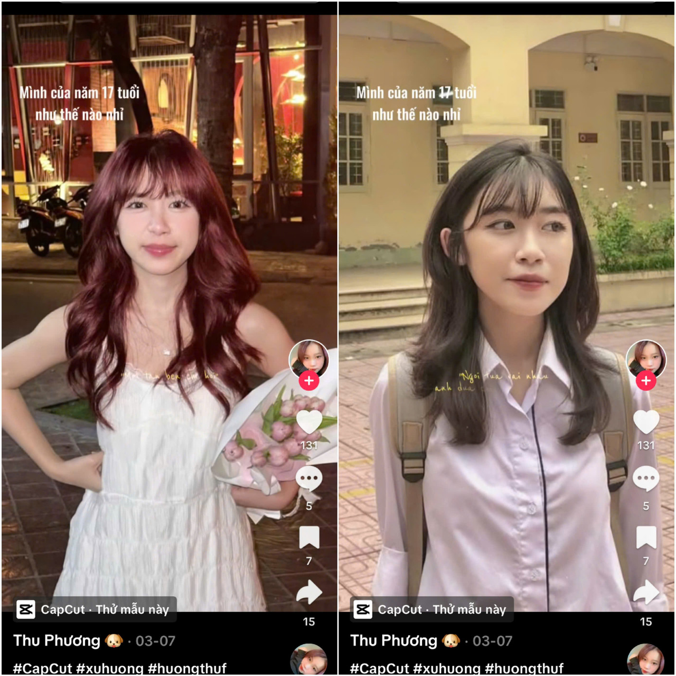 Với Khánh Chi (sinh năm 2002, Tuyên Quang), tuổi 17 là khoảng thời gian cô nàng lần đầu rời xa gia đình để lên thành phố học nội trú. “Lúc ấy mình chưa quen môi trường mới, cảm thấy rất cô đơn và nhớ nhà. Nhưng cũng nhờ vậy, mình học được cách tự lập và trưởng thành hơn rất nhiều,” Chi chia sẻ. Ngay khi thấy trend này trên TikTok, Chi đã lục lại ảnh cũ thời cấp ba và đăng tải cùng lời nhắn: “Cảm ơn tuổi 17 vì đã dạy mình biết mạnh mẽ.”