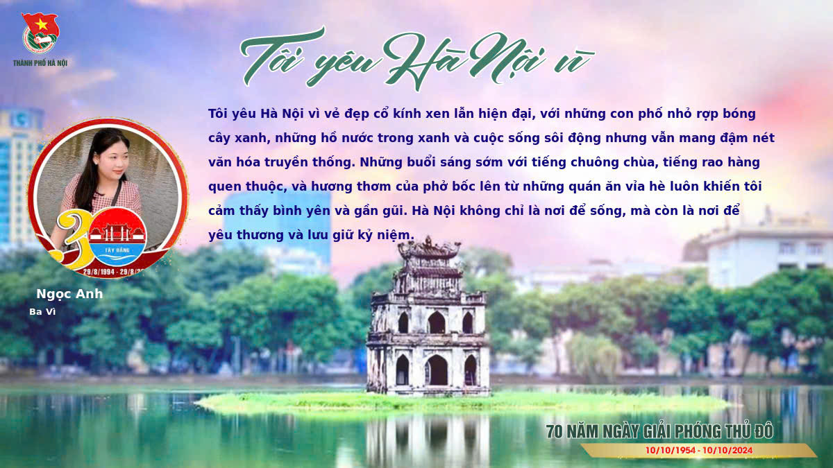 Trào lưu “Tôi yêu Hà Nội vì…” do Thành Đoàn Hà Nội phát động, nhằm tạo không gian để bạn trẻ và bất cứ ai cũng đều có thể gửi thông điệp để bày tỏ tình yêu với Thủ đô ngàn năm văn hiến và anh hùng. Đây là một trào lưu ý nghĩa nhằm hướng tới chào mừng kỷ niệm 70 năm Ngày Giải phóng Thủ đô.