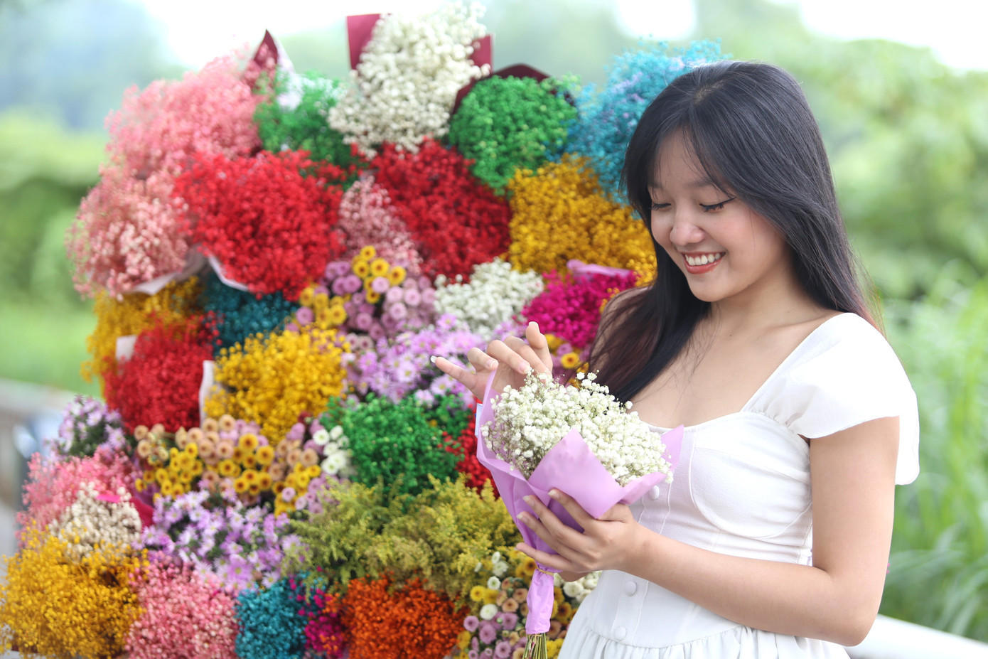 | Đôi bạn trẻ thích thú tạo dáng chụp ảnh cùng những bó hoa baby. |