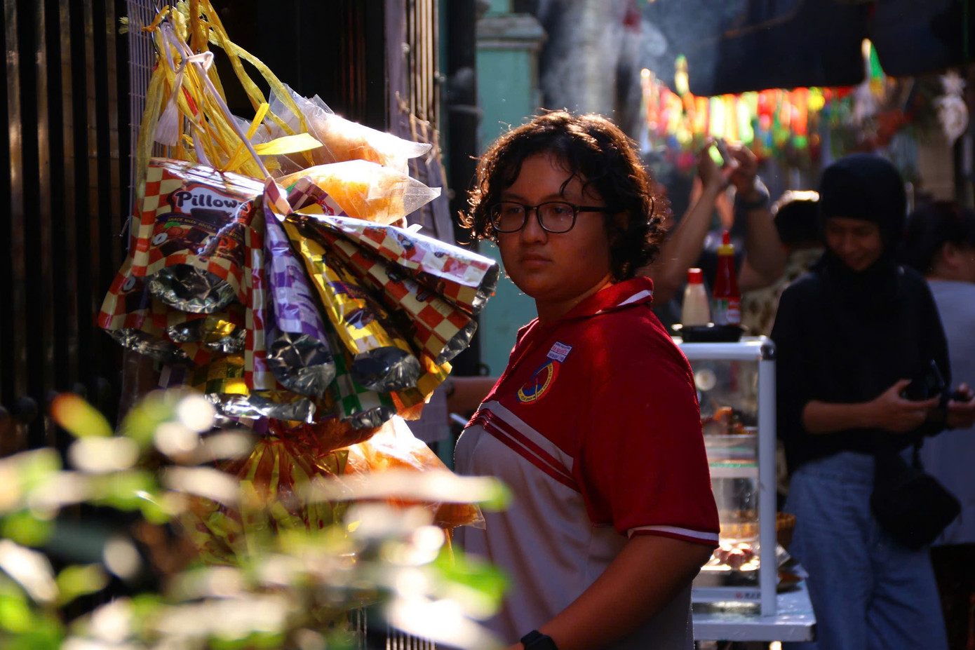 | Một bạn trẻ đang mua đồ ăn tại một gian hàng bán các món đậm chất Hồi giáo. |