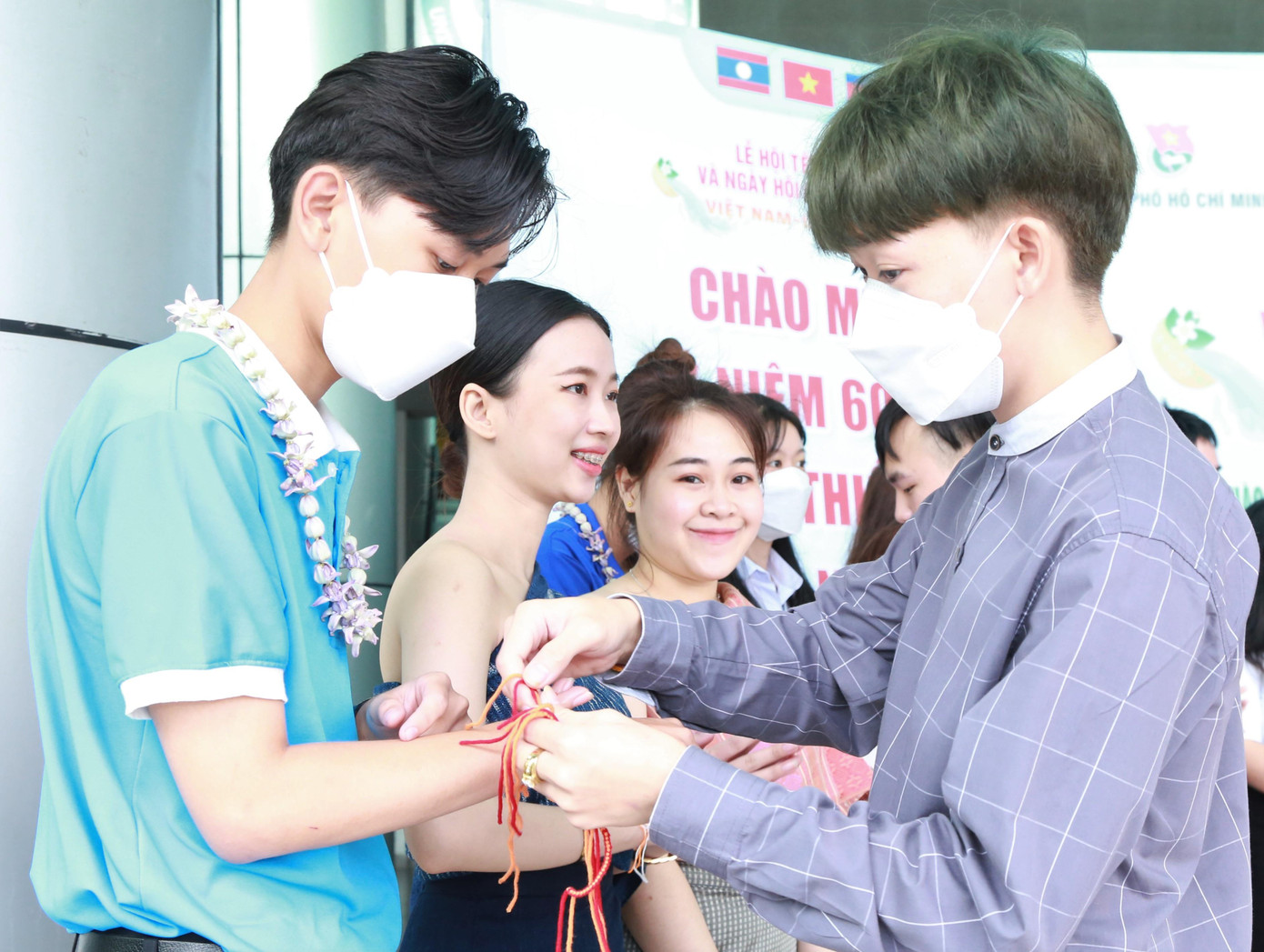 | Các bạn sinh viên Lào - Campuchia buộc chỉ tay, vẩy nước thơm và đeo vòng hoa đặc trưng của đất nước mình cho các đại biểu và sinh viên Việt Nam. |
