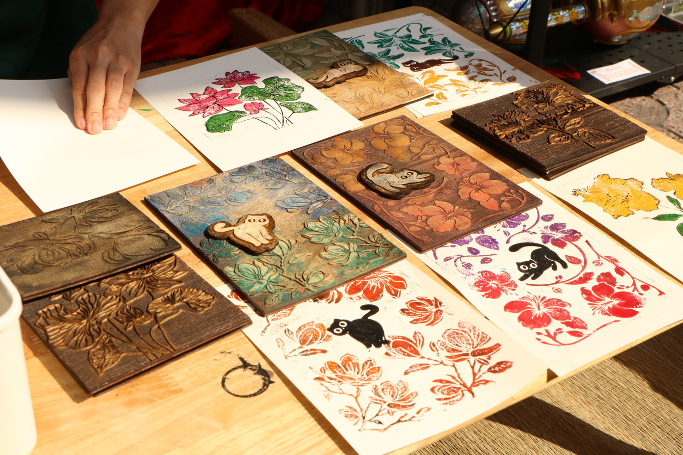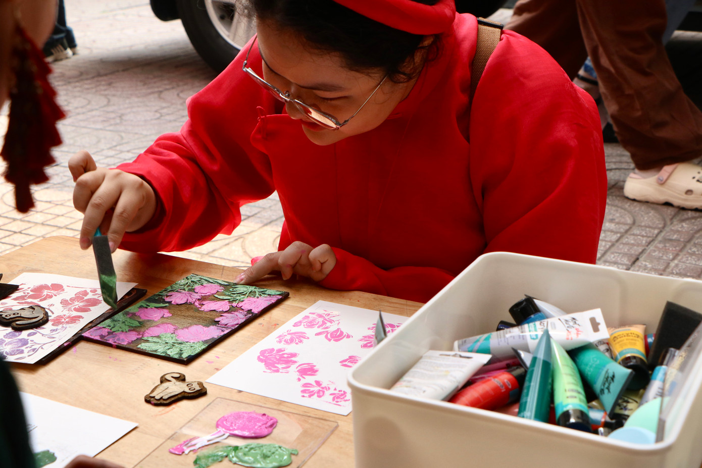 | Đắm chìm trong không gian trải nghiệm vẽ tranh mộc bản, Gia Nghi (năm thứ ba, trường ĐH KHXH&NV, TP. HCM) vui vẻ chia sẻ: “Đây là gian hàng ấn tượng nhất đối với mình. Được tự tay làm một bức tranh, tự chọn mẫu, chọn màu rồi in, mình thấy rất hào hứng. Làm rồi mới thấy để có được một bức tranh đẹp người thợ phải vô cùng khéo léo, tỉ mỉ để màu in không lem, không nhoè”. |