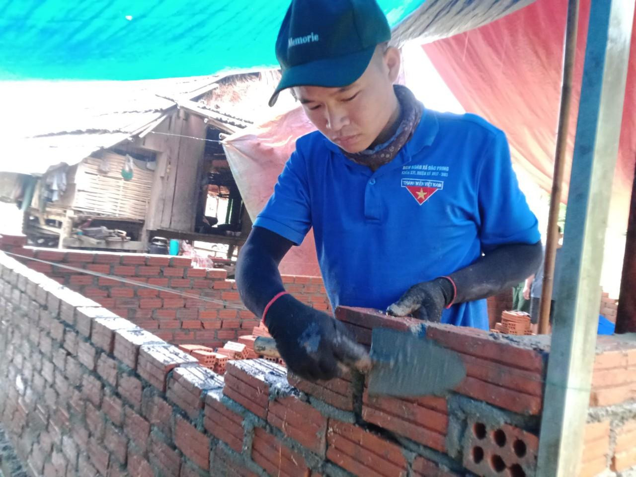 Sau khi vật liệu được vận chuyển, các bạn trẻ bắt tay vào việc dựng nhà xây cho gia đình anh Gióng. Công trình có giá trị hơn 100 triệu đồng từ đóng góp của tuổi trẻ Huyện Đoàn Nam Giang và sự giúp đỡ của các doanh nghiệp, mạnh thường quân trên địa bàn. Các bạn trẻ góp công, tình nguyện xây dựng, hoàn thiện căn nhà tình nghĩa.